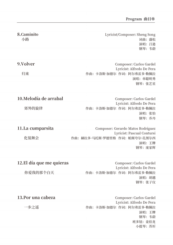 阿斯托尔·皮亚佐拉是近现代阿根廷首屈一指的探戈音乐家,为探戈音乐的推广和革新做出了重要贡献。他的器乐作品几十年来广泛活跃在世界各地的舞台上,但很少有乐团表演他的声乐作品。本次音乐会精心挑选并改编了他的七首声乐作品,将为听众呈现一个不一样的皮亚佐拉。
