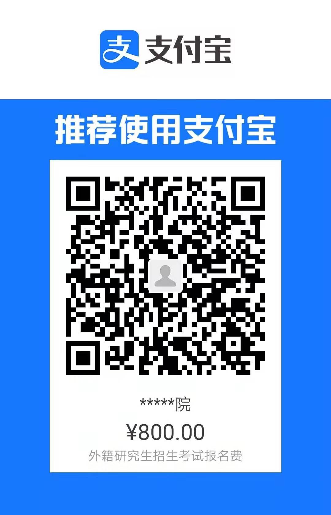 5.缴费成功截图。考生须使用支付宝扫描下方二维码支付报考费800元,备注姓名、报考研究方向,缴费成功后,上传订单截图,以“5.缴费截图”命名。考生的一切费用自理,报名后不参加考试者费用不退。