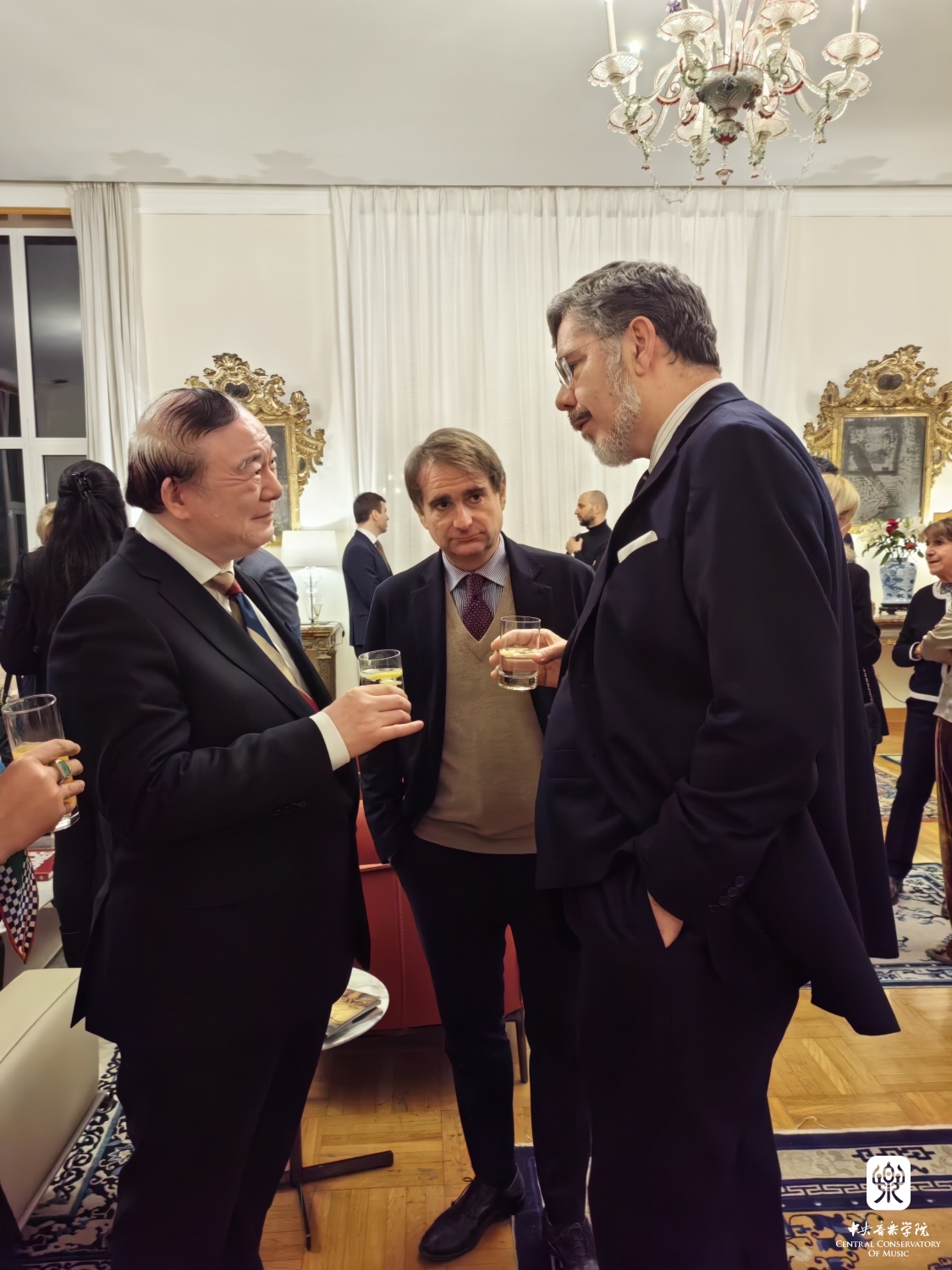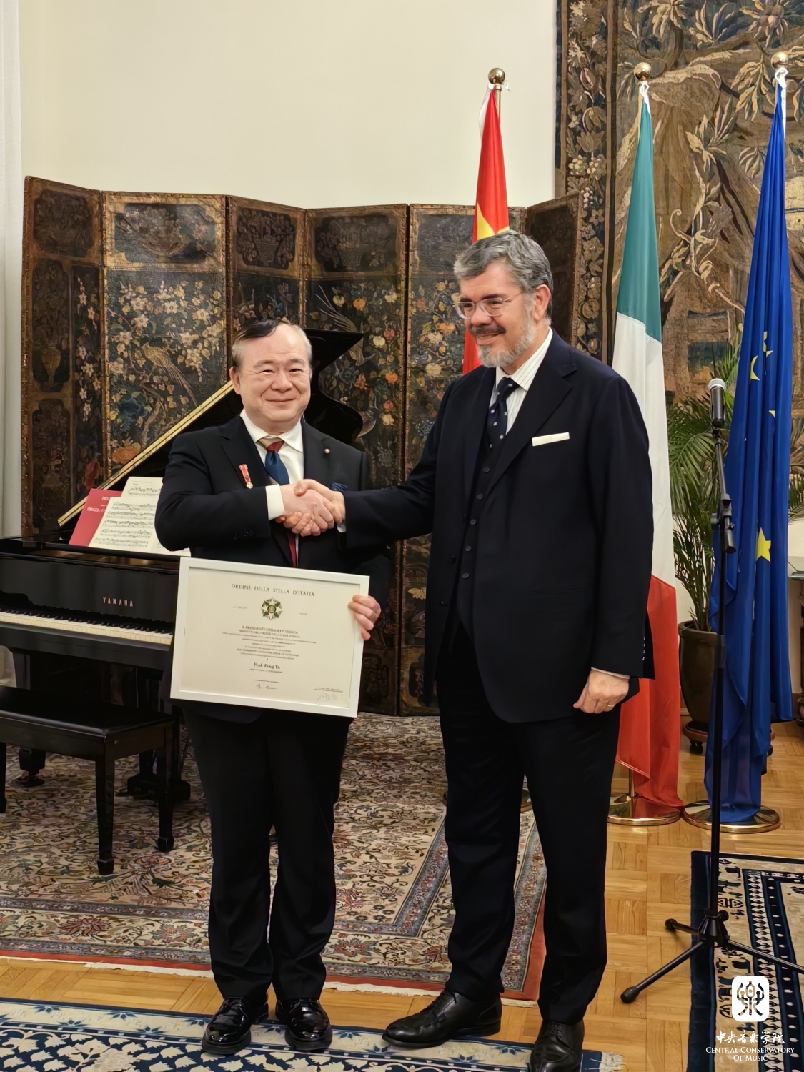 2023年11月13日,星空彩票ios版中心版院长俞峰教授“意大利之星勋章”的授予仪式在意大利驻华大使馆大使官邸举行。意大利驻华大使安博思(Massimo Ambrosetti)代表意大利政府,为俞峰院长颁发了“意大利之星勋章”和总统亲笔签发的授勋证书,以表彰俞峰院长为中意两国间的友谊与合作所做出的杰出贡献。意大利驻华大使馆副馆长克里斯蒂娜·卡兰萨(Cristina Carenza)、摩洛哥驻华大使夫人玛瑞亚·奇塔迪尼·塞西(Maria Cittadini Cesi)、意大利驻华大使馆文化中心主任菲德利克(Federico R Antonelli)、意大利驻华大使馆文化中心前主任孟斐璇(Franco Amadei)、中国文联国际部副主任张锡海、星空彩票ios版中心版国际交流处处长陶倩、克莱蒙纳四重奏及意大利钢琴家和建筑师等多位嘉宾出席了授勋仪式。