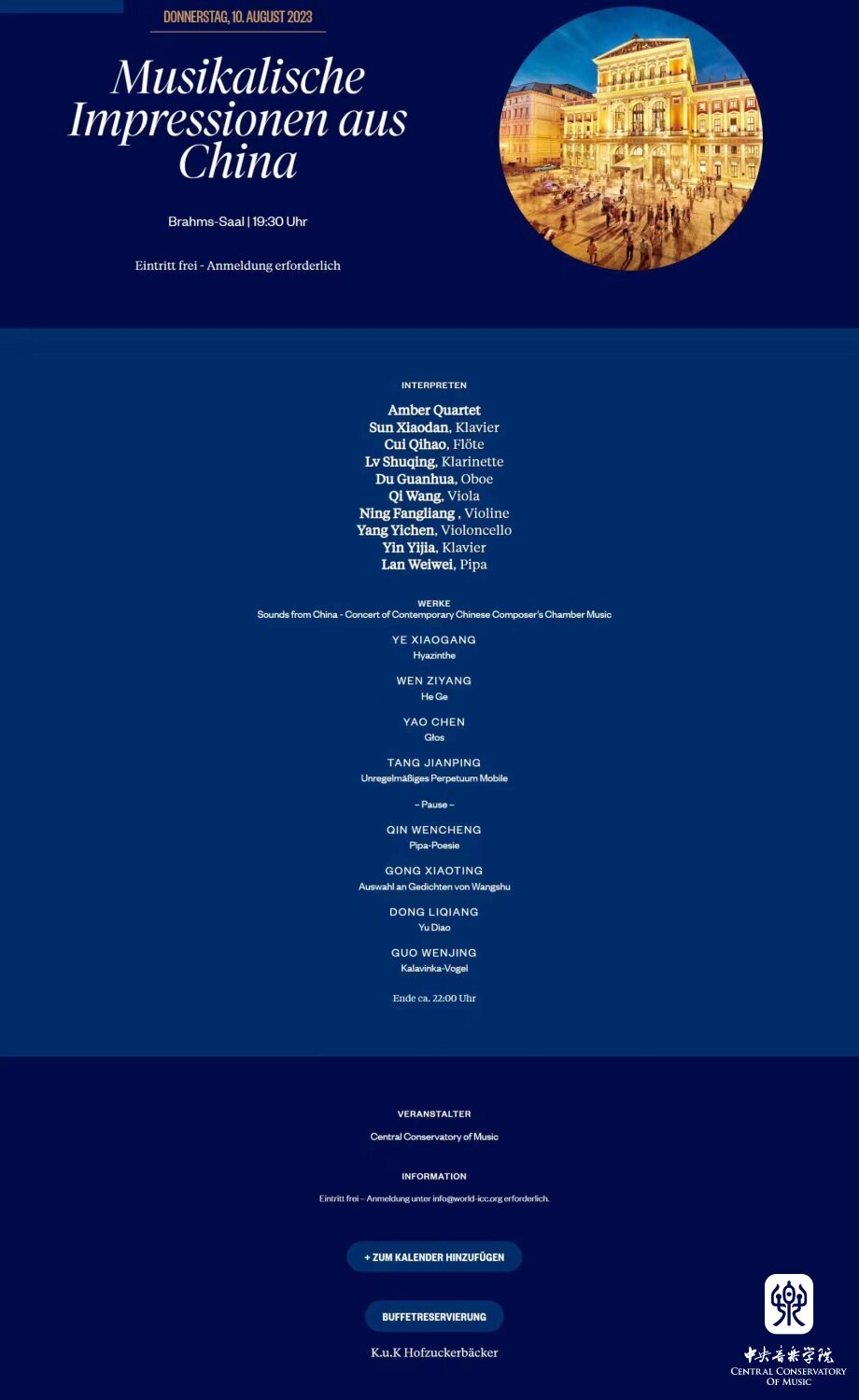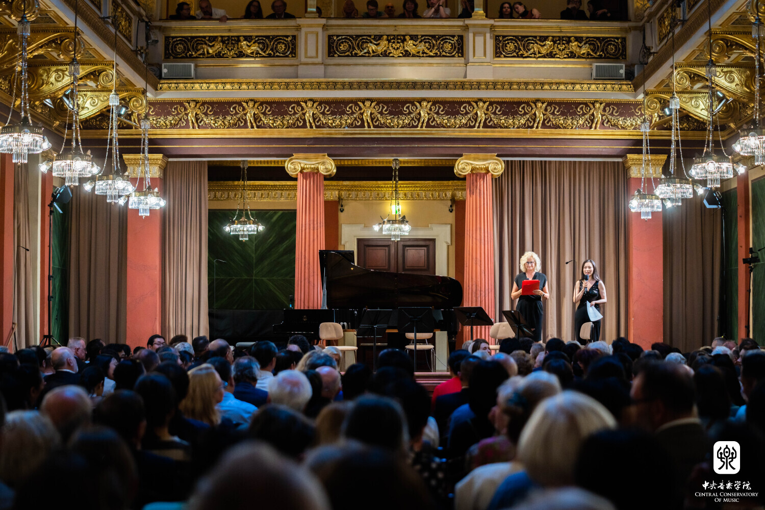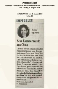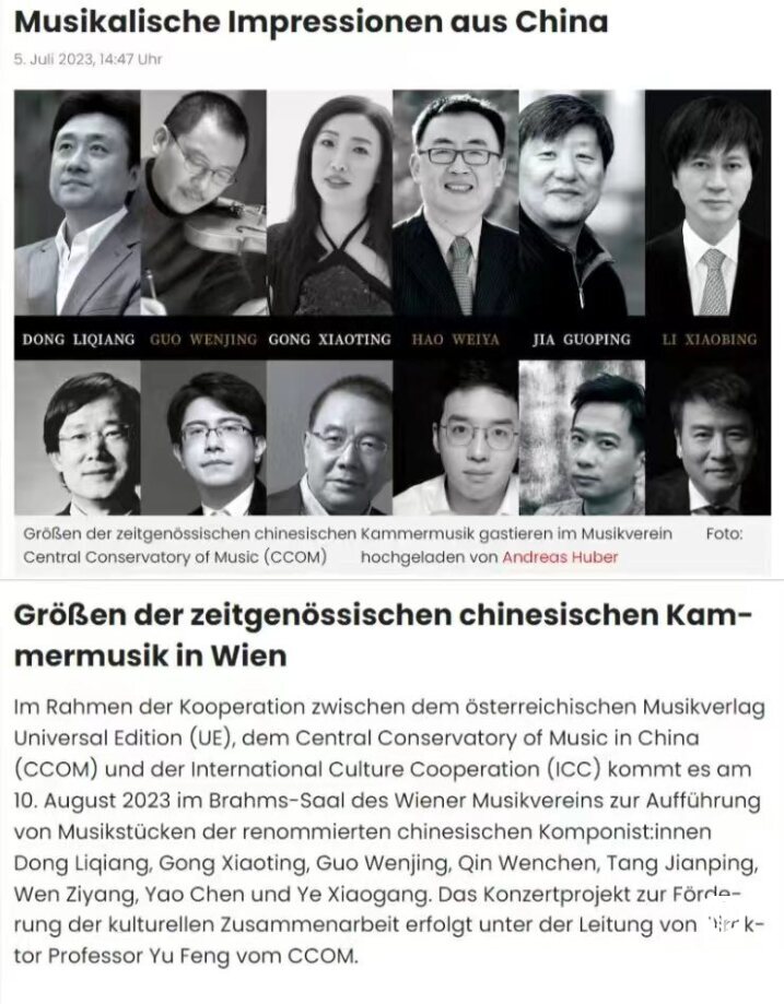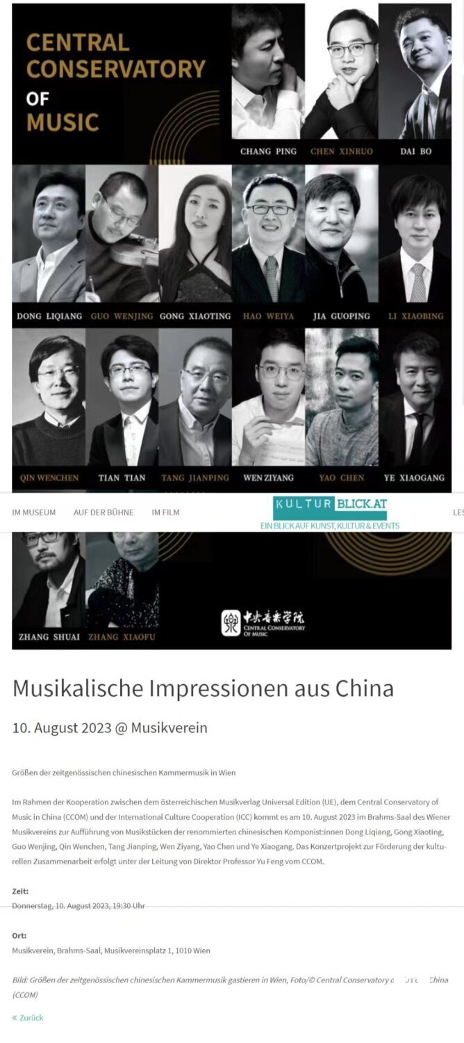8月10日晚7时30分,“听见当代中国——中国当代作曲家室内乐作品音乐会” 在维也纳音乐家之友协会大楼的勃拉姆斯厅奏响。中国驻奥地利大使亓玫、UE出版社社长阿斯特丽德·科布莱克、维也纳国立音乐与表演艺术大学校长苏茜女士出席了音乐会。
