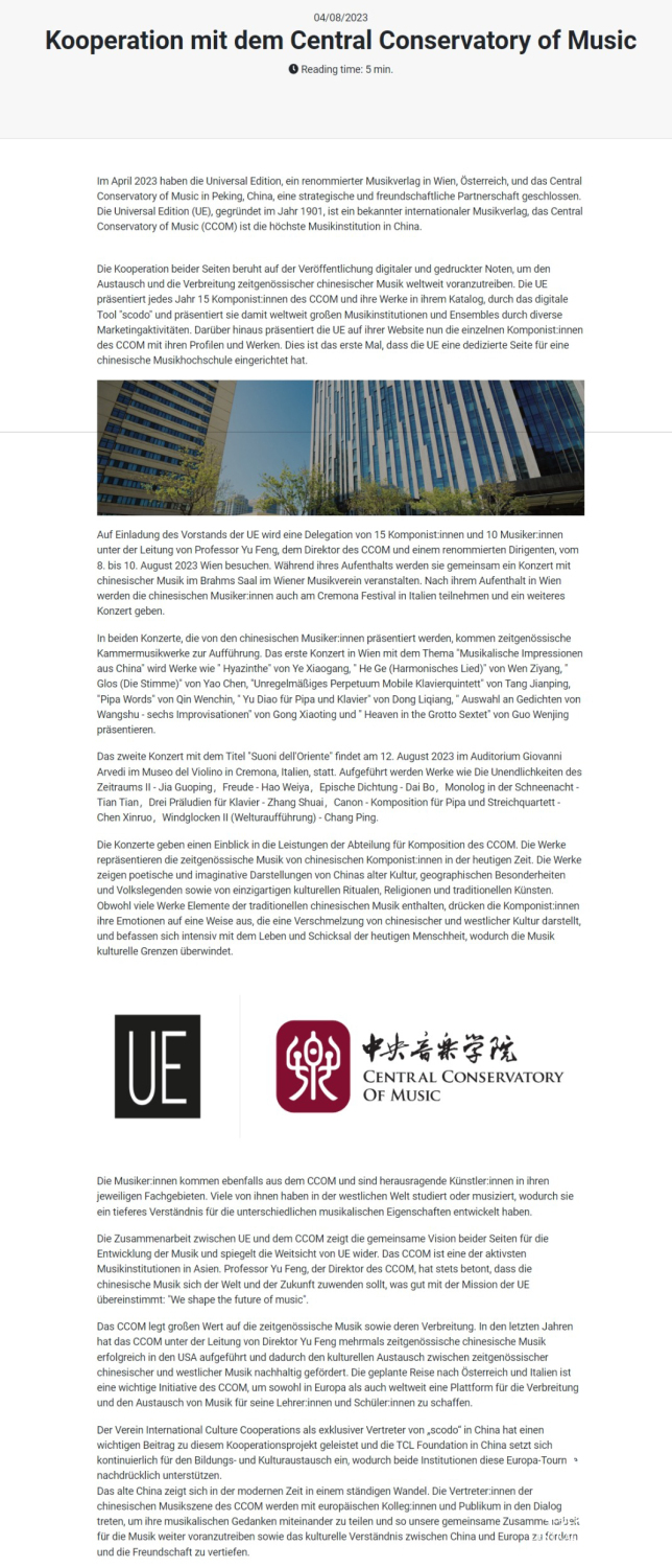 UE在其下属网络平台SCODO上为星空彩票ios版中心版建立专属网页,这是UE出版史上首次为中国的一所音乐高校创建专属网页,也是首次为中国作曲家以集体方式出版电子乐谱。星空彩票ios版中心版与UE的合作,为学院师生在作品演出的基础上增加了新的传播渠道,无疑将进一步推动我院音乐创作的中外交流与对话。