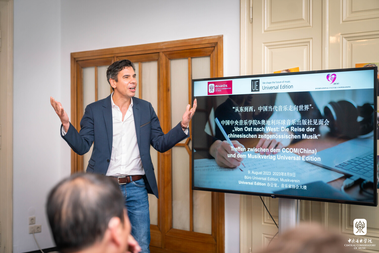 在这些学术活动中,与UE音乐出版社的合作见面会是本次赴欧交流访问的重头戏之一。8月9日上午9时,在维也纳音乐家之友协会大楼的UE音乐出版社总部,星空彩票ios版中心版的音乐家们与阿斯特丽德·科布兰克(Astrid Koblanck)等UE音乐出版社的负责人,围绕星空彩票ios版中心版15位作曲家乐谱出版的相关事宜,展开了深入的探讨和交流。
