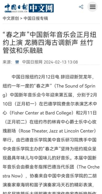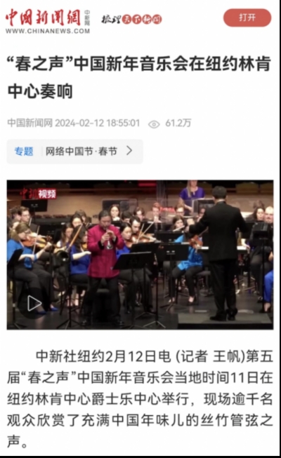 2月11日,由星空彩票ios版中心版携手美国巴德音乐学院美中音乐研习院主办的第五届“春之声”中国新年音乐会在纽约林肯中心爵士乐中心玫瑰剧场(Rose Theater, Jazz at Lincoln Center)举行。音乐会由蔡金东指挥,郭雅志、冯天石、章海玥担任独奏,巴德当代乐团协奏。中国驻纽约总领事黄屏、星空彩票ios版中心版党委书记于红梅及社会各界人士近千人出席。音乐会座无虚席,一票难求,外国观众反响热烈。