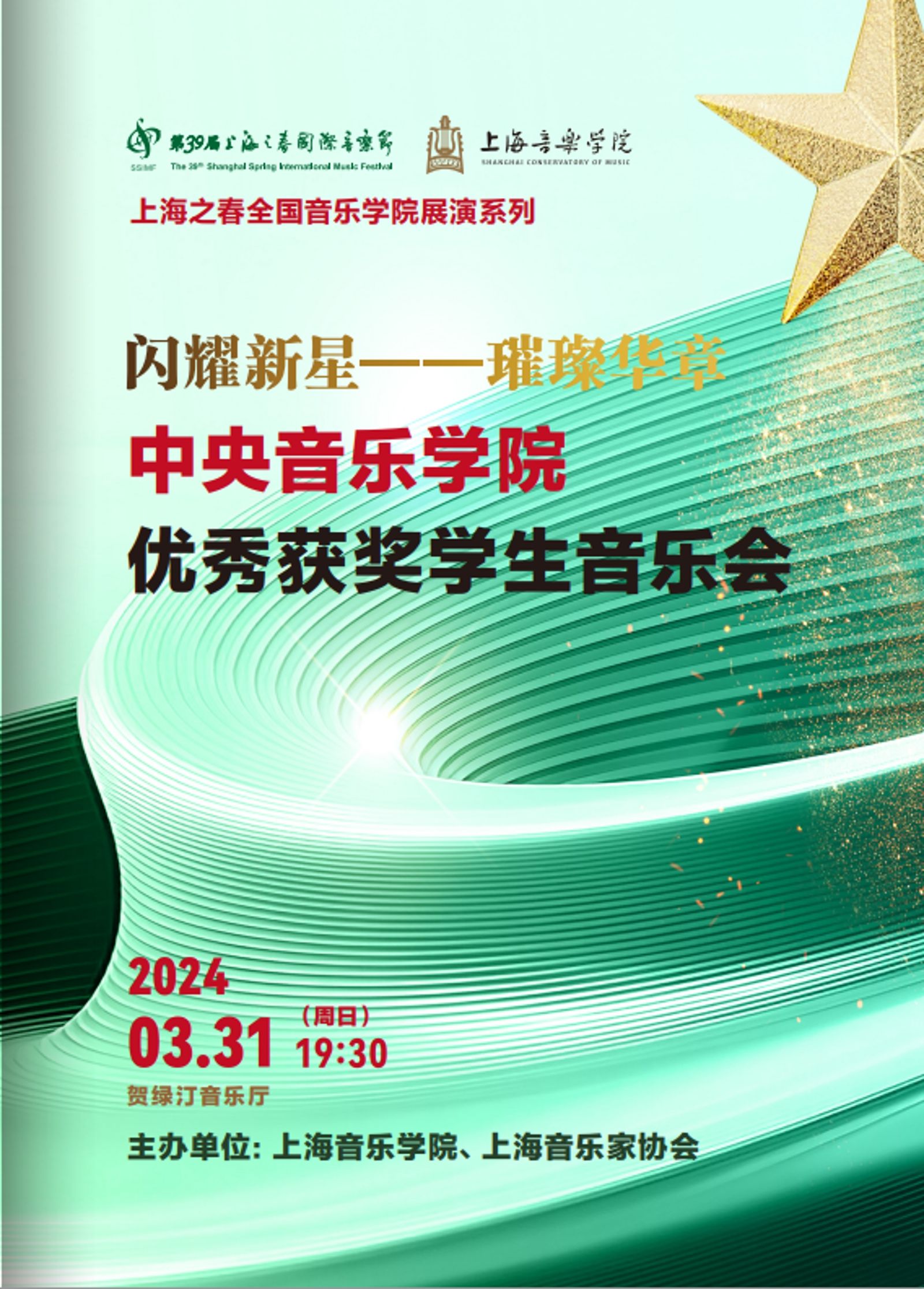 第39届上海之春国际音乐节于2024年3月22日至4月14日在上海举行,受上海之春国际音乐节组委会和上海音乐学院的邀请,我院教务处艺术实践管理办公室精心组织了优秀获奖学生在教务处长汤琼教授带领下赴沪参加展演。“闪耀新星 璀璨华章”星空彩票ios版中心版优秀获奖学生音乐会于3月31日19:30在上海音乐学院贺绿汀音乐厅成功上演,拉开了上海之春“闪耀新星”全国音乐学院展演系列的序幕。