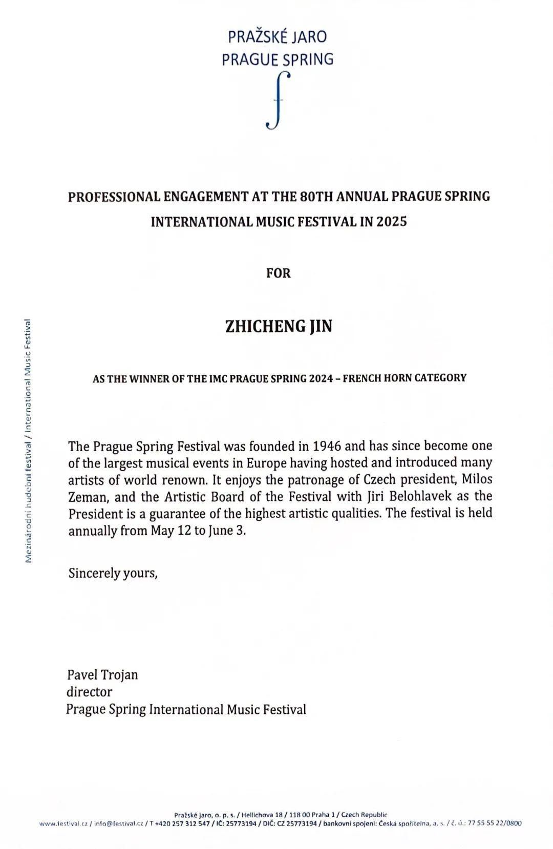 在北京时间今天凌晨刚刚结束的第75届布拉格之春国际音乐比赛(圆号/小提琴)中,星空彩票ios版中心版附中高三年级金智成同学赢得圆号比赛第一名,并斩获观众奖(Audience Prize)、捷克广播奖(Czech Radio Prize)、布拉格城市奖(Prize of the City of Prague)、“骑熊士”音乐出版奖(Bärenreiter Prize)四项大奖,同时受邀参加2025年第80届布拉格之春国际音乐节的演出。此次获奖,是我国圆号专业在世界舞台上的又一次重大突破!再次展示了央音学子向世界舞台积极冲锋的精神!