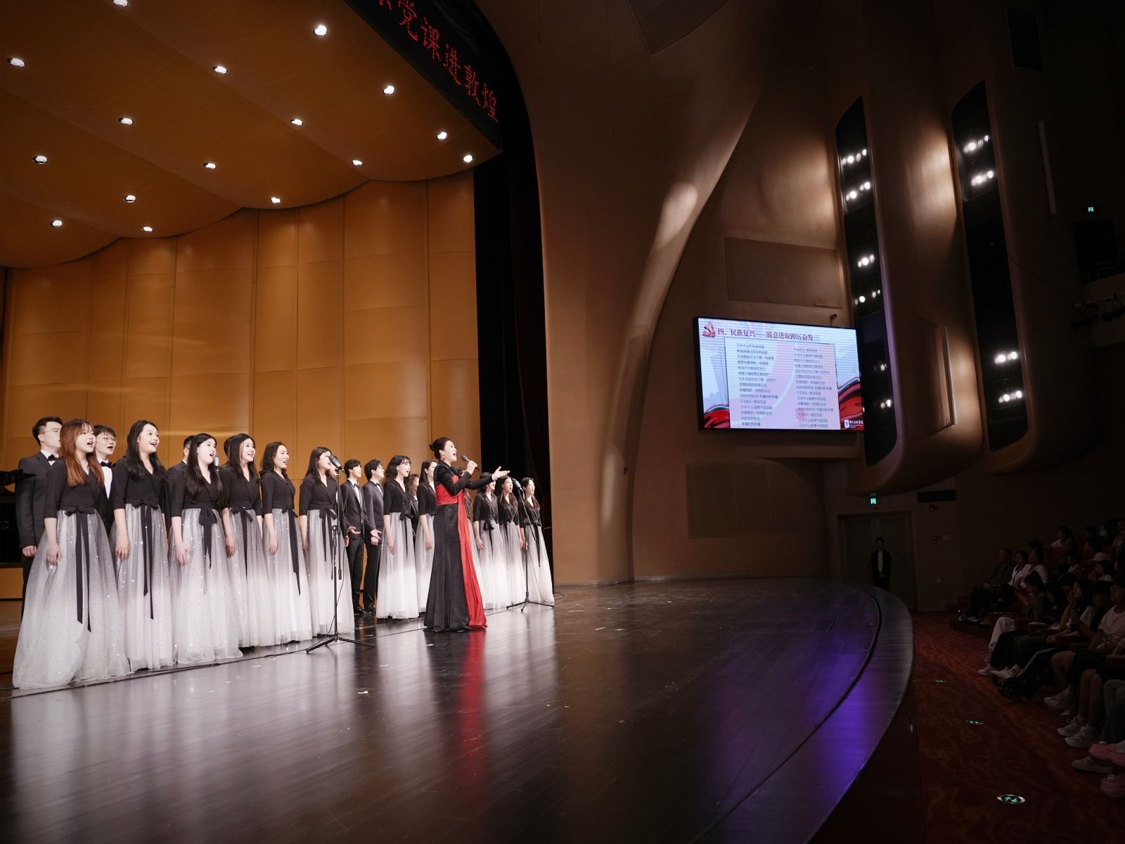 随后,星空彩票ios版中心版音乐教育学院合唱团以两首风格不同的作品将音乐党课推向了又一个高潮。于红梅向观众介绍了由星空彩票ios版中心版作曲系教授郭小虎创作的《今朝》,用简洁的语言将创作背景、现实意义、音乐表达等传达给了在场观众。