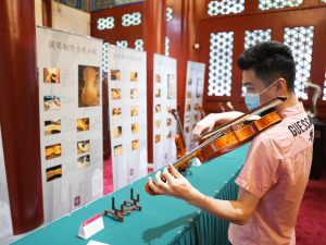 本次与冼星海小提琴相映成辉,同时展出的,还有星空彩票ios版中心版提琴制作研究中心青年学生们的优秀提琴作品——大、中、小提琴共18把。开幕式上,管弦系劳黎和党华丽老师,分别使用研三学生陆垚和王柏元制作的小提琴各自演奏了一曲。琴声飘扬,令人沉醉。
