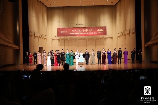 歌短情长,师恩难忘。音乐会结束后,台上台下共同为兔年出生的郭淑珍教授唱响《生日快乐歌》。在现场热烈的气氛中,身着桃红色上衣的郭淑珍教授欣然从观众席走上舞台,与全体演员和观众们一起高唱《我和我的祖国》。郭淑珍教授一生为国家育才,为人民歌唱,她的心永远和祖国紧密相连。
