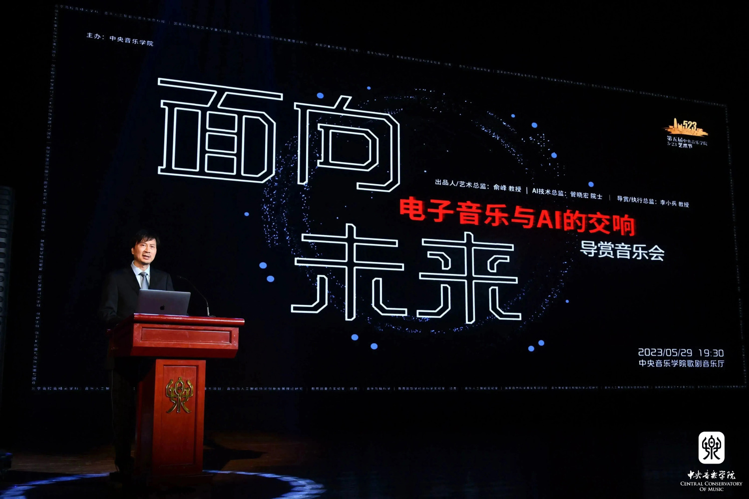 音乐会由俞峰校长担任艺术总监,管晓宏院士担任AI技术总监,音乐人工智能与音乐信息科技系主任李小兵教授担任执行总监并主持音乐会,是国内首场深度融合AIGC、3D音频、脑科学等前沿科技的音乐会。作曲家和音乐科技专家都是我校音乐人工智能与音乐信息科技系的师生,他们充分利用人工智能、脑科学等领域的最新成果,通过协同创作的形式,将电子音乐带入人工智能时代。