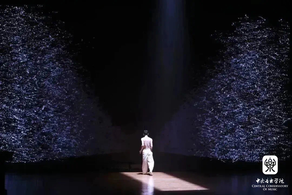 今晚的第一首作品,是栾家的《五蕴》。这首作品利用红外体感动作捕捉技术,并结合计算机视觉,使舞蹈演员的动作实时生成影像并触发声音,形成体态、影像、音乐间的三重交互,构建出一个沉浸式的视听空间,表现了人在对物质、感受、意念、行为和意识颠覆与超越后,达到内心平静与解放的境界。