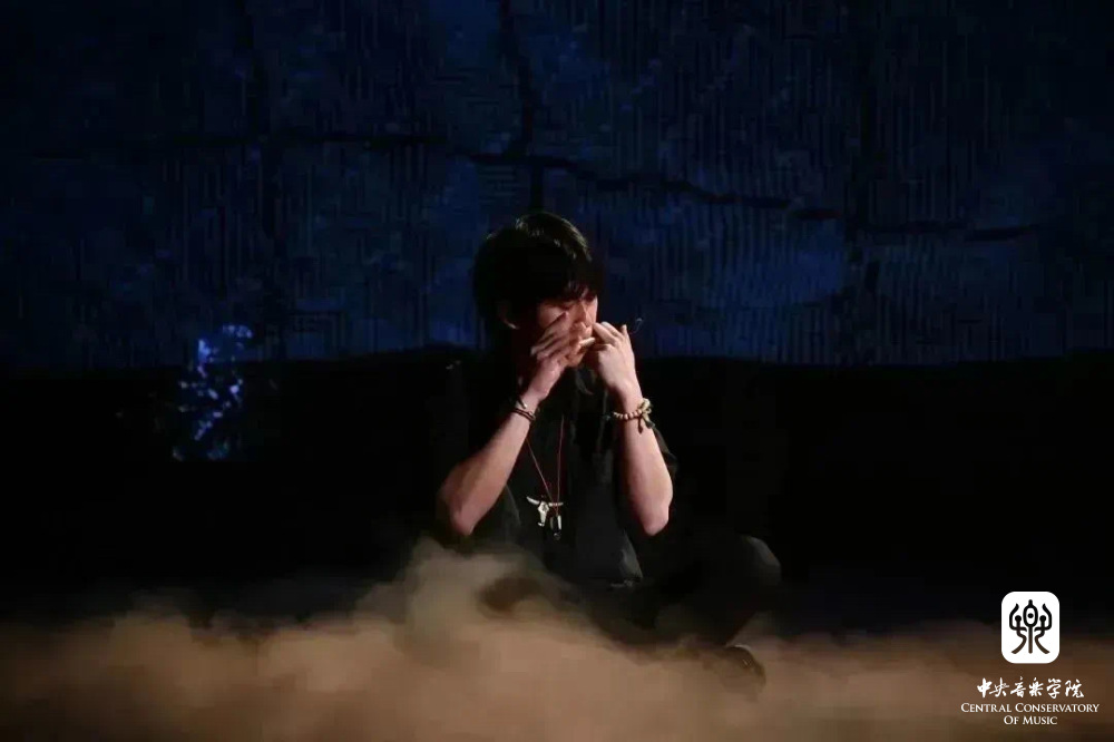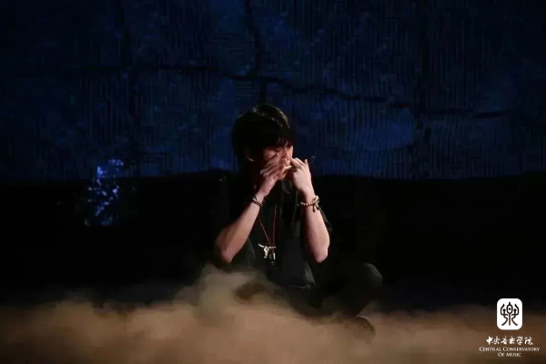 第四首作品,是栾家作曲的《< 厄>之二 ——司岗》 ——“得”“铃”“口弦”与电子音乐的多维对话。这首作品是一首由少数民族民间乐器与电子音乐相融合的作品。在标题中,厄是形意字,本身有困苦之意,意为山下有一个曲卷的人。云南世居民族,多为同宗,并有高山崇拜的习俗。本作品为《厄》系列第二部,“司岗”在佤族语言中指原初之地的崖洞,祖先从这里走出并繁衍生息。作品采用佤族“得”“口弦”“铃”等民间乐器进行现场演奏,使用手势控制器与MPC对现场演奏的声音进行实时变形与重塑,并通过手机实时控制声音的现场三维位置移动。在作品开始前,李小兵教授介绍了演奏者徐申阳及导师俞峰校长、李伟教授的情况。他自豪地表示,音乐人工智能系近几年招收的都是复合型人才,以徐申阳为代表,个个都是“多面手”,同时具备深厚的工科背景和较高的艺术造诣。