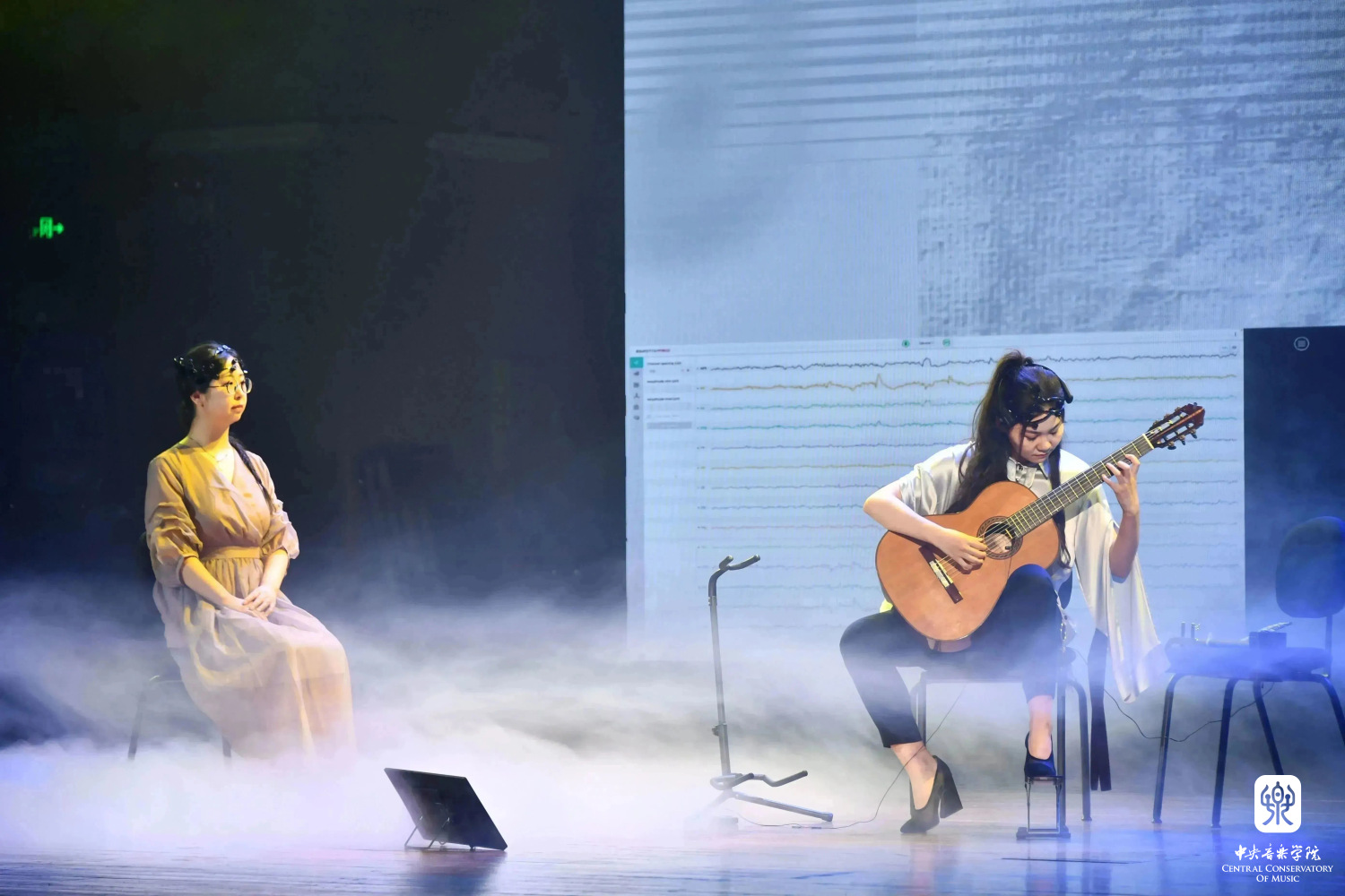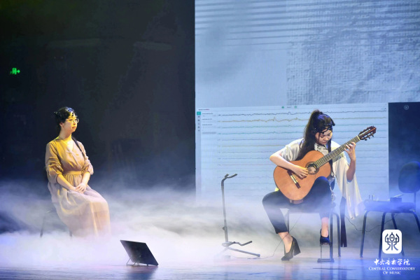 第五首作品《云间虹霓》就是利用了脑科学相关研究成果,并结合AI技术的电子音乐作品。作品通过二胡和吉他,这两种分别具有东西方特色的乐器来呈现,生动地诠释了灭世洪水的传奇故事,同时也挑战了音乐创作与表达的传统边界。