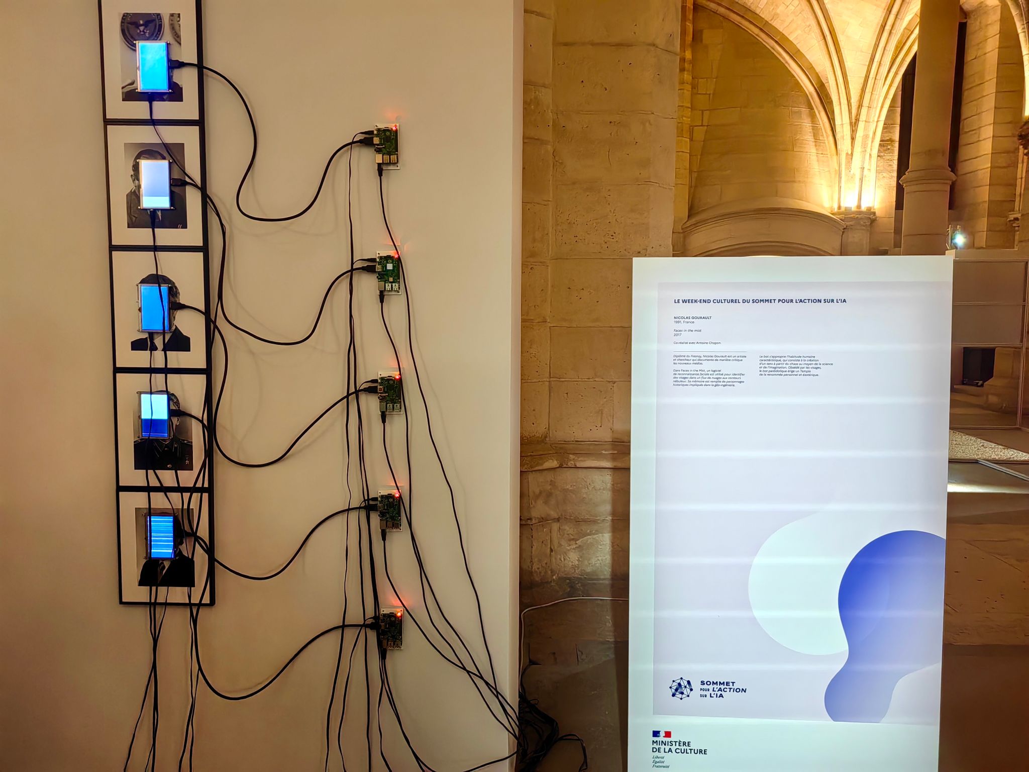在峰会的AI实践应用、艺术及创新项目的展台前,我院代表与部分法国艺术科创公司代表进行了交流;通过参观巴士底狱举办的创意与人工智能:Machina Sapiens艺术装置展览,了解到二十多位法国和国际艺术家展现的生成式人工智能对艺术的探索以及社会的影响。人工智能技术的快速发展使艺术家意识到人工智能不仅可以改变艺术创作的过程,还产生了一些前所未有的表现形式和新的叙事手法。