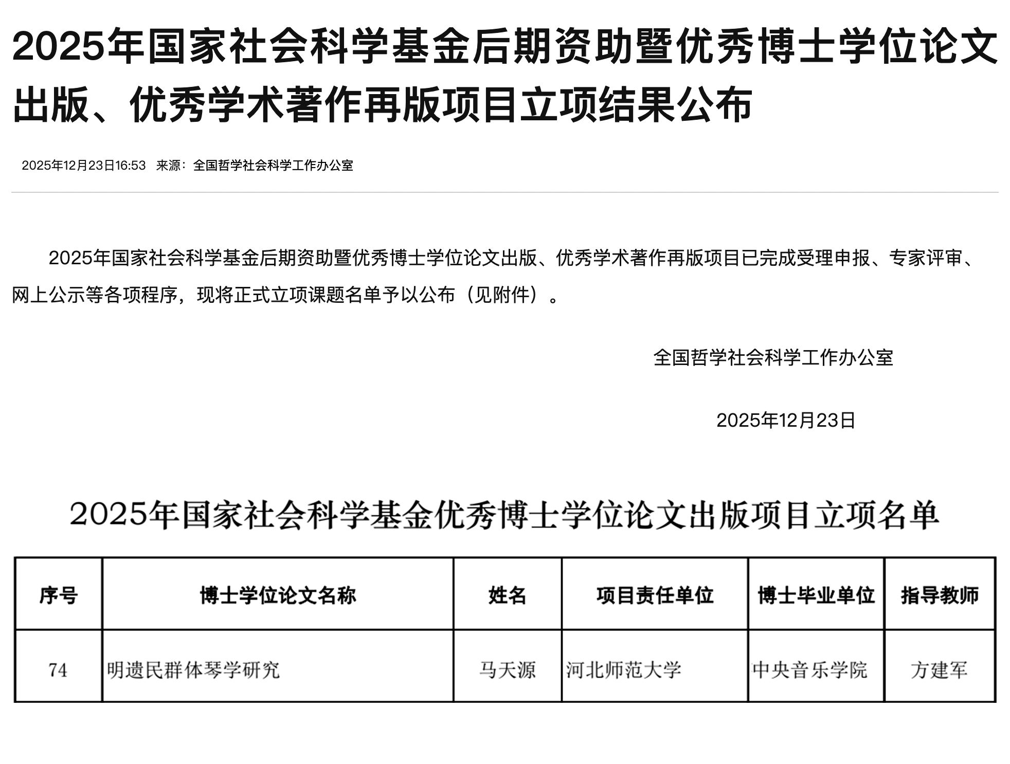 近日,全国哲学社会科学工作办公室公布2025年国家社科基金优秀博士学位论文出版项目立项结果。我校音乐学系2023届博士毕业生、现就职于河北师范大学音乐学院的青年教师马天源的博士学位论文《明遗民群体琴学研究》成功获批,成为本年度该项目中唯一获资助的音乐类博士学位论文,这也是音乐学系博士毕业生连续第二年获此殊荣。