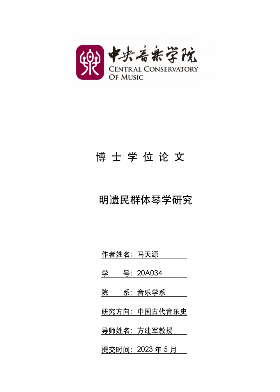 马天源为我校音乐学系2023届博士毕业生,研究方向为中国古代音乐史。其博士学位论文《明遗民群体琴学研究》,以明遗民中的琴人群体作为研究对象,将其放置在明清易代之际的特殊历史环境中进行考察,对明末清初社会、遗民琴人群体与古琴艺术三者之间的关系进行了深入探讨。史料翔实,视角新颖,论证严谨,较为系统地梳理和阐释了该群体在琴学史中的特殊地位与影响。论文由我校特聘教授方建军教授指导。