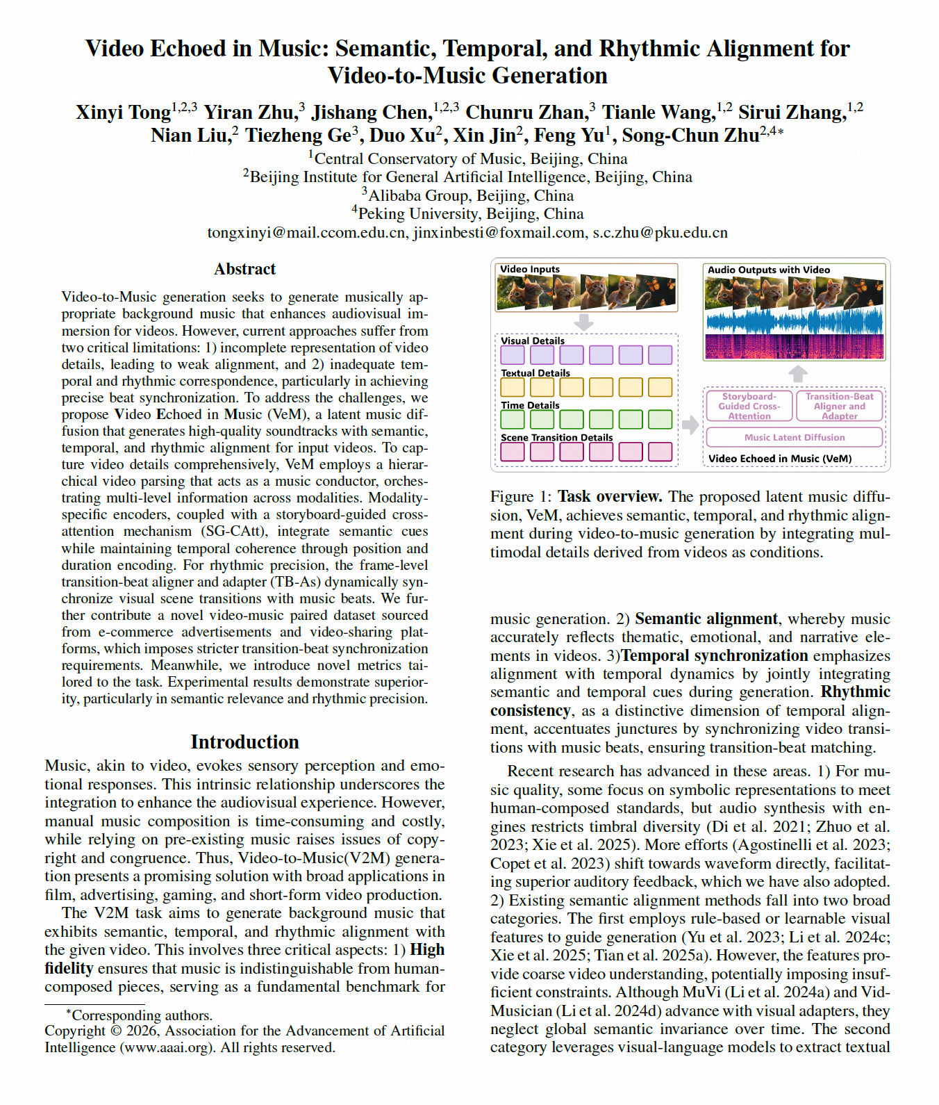 近日,人工智能领域国际顶级学术会议AAAI 2026公布录用结果。我校音乐人工智能与音乐信息科技系博士生童心怡、陈吉尚等的论文《Video Echoed in Music: Semantic, Temporal, and Rhythmic Alignment for Video-to-Music Generation》从全球23,680篇高水平投稿中脱颖而出,被Main Technical Track接收,并获得了Oral Presentation(大会口头报告)的殊荣。AAAI(Association for the Advancement of Artificial Intelligence)是国际人工智能领域历史最悠久、影响力最广泛的顶级学术会议之一,也是中国计算机学会(CCF)推荐的A类国际会议。作为全球人工智能研究的“风向标”,AAAI一直以录用标准严格著称。中稿论文能够获得会议Oral Presentation难度极高,仅有在原创性、学术影响力、技术突破性与行业引领性等方面达到国际前沿的成果才能入选。AAAI 2026将于1月20-27日在新加坡举行,届时将成为全球AI学者交流与合作的重要平台。这一成果标志着我校在音乐人工智能领域的创新研究再获得国际学术界的高度认可,并在技术与学术影响力上迈入全球领先行列。