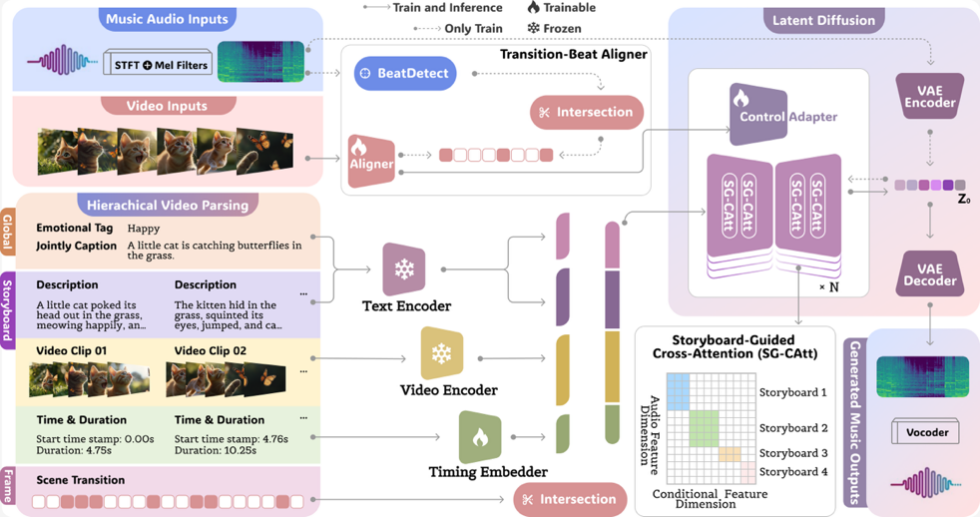 为了解决上述难题,星空彩票ios版中心版、北京通用人工智能研究院与阿里巴巴集团联合团队提出了视频配乐生成框架VeM(Video Echoed in Music)。该框架首次将多层级视频解析结果作为音乐生成的“指挥”,在潜空间扩散模型中融合全局语义、分镜级时间信息及帧级场景转场,通过分镜引导跨注意力机制(SG-CAtt)精确实现语义与时间双对齐,并结合转场-节拍对齐器与适配器(TB-As)在帧级实现场景切换与节拍事件的精准同步,从而同时满足视频配乐的情绪契合度与节奏精度。在模型训练过程中,团队构建了专为转场-节拍同步设计的高质量视频音乐数据集TB-Match,并引入了适配该任务的全新节奏对齐评测指标,使生成与评价环节在时间与节奏特性上形成闭环优化。