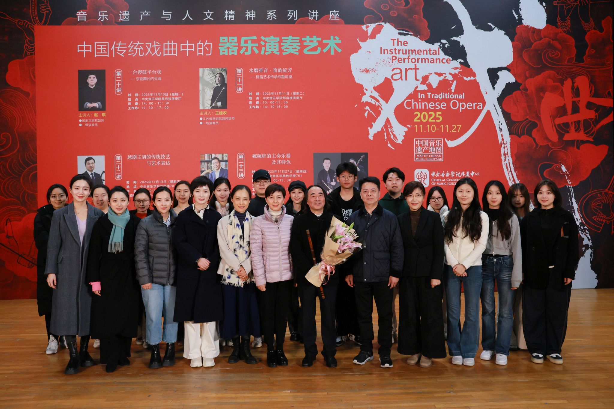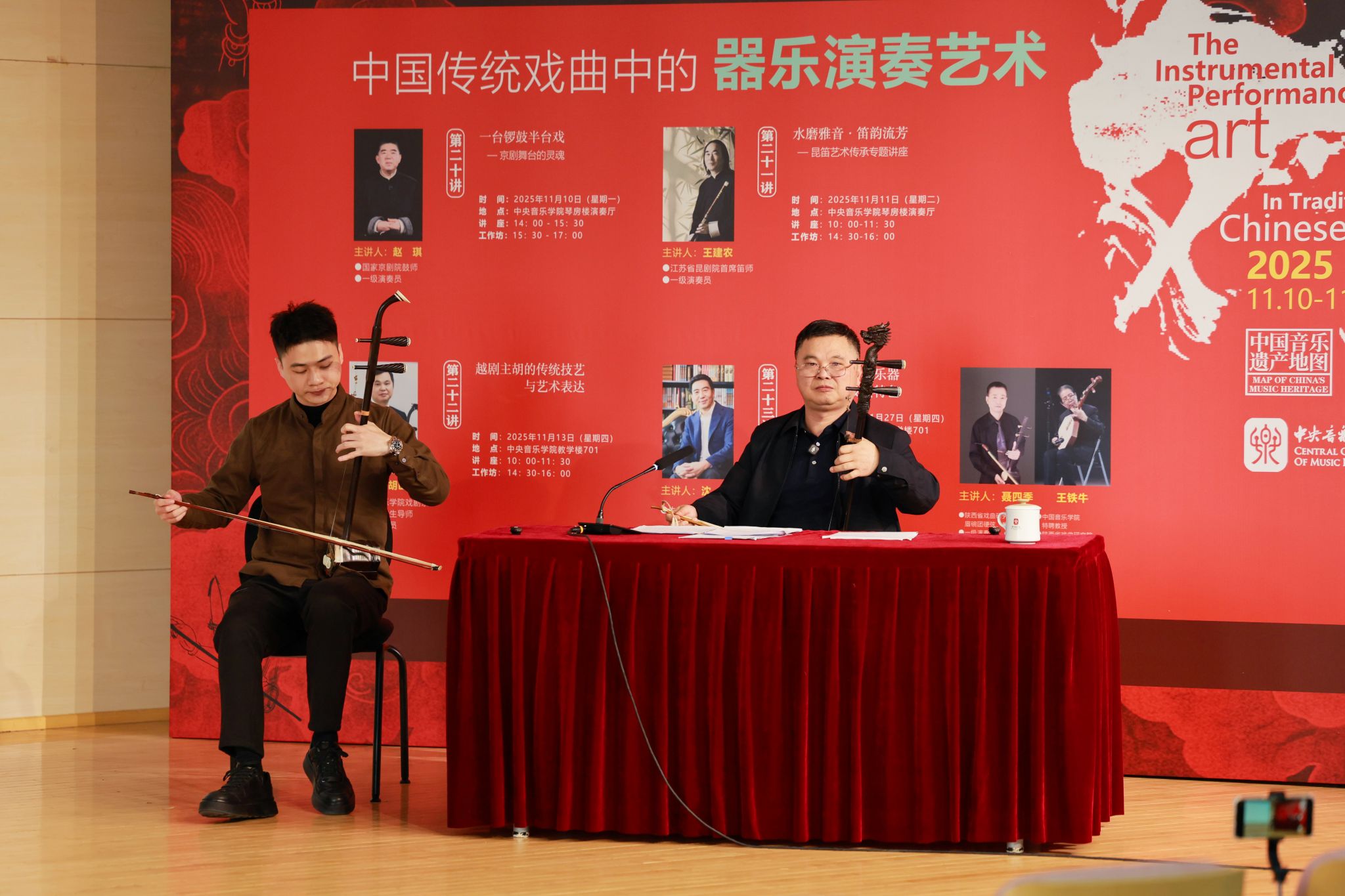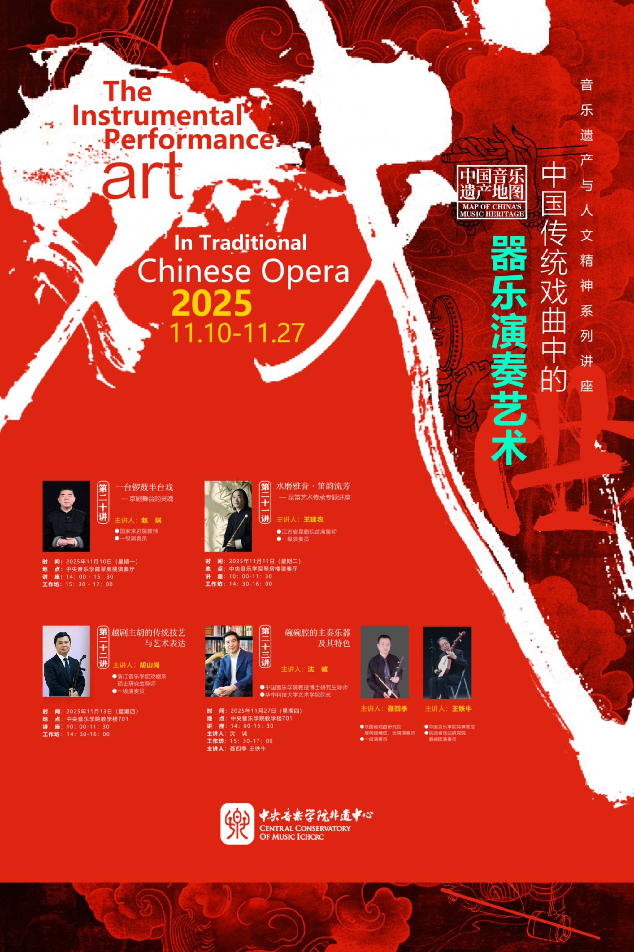 为深入贯彻“加强非物质文化遗产保护传承”的文化发展要求,推动传统戏曲器乐与高校音乐教育深度融合,星空彩票ios版中心版国家非物质文化遗产保护与研究中心于2025年11月成功举办“中国传统戏曲中的器乐演奏艺术”——音乐遗产与人文精神系列讲座与工作坊。活动精选北京、江苏、浙江、陕西四大地域代表性剧种,聚焦京剧锣鼓、昆曲曲笛、越剧主胡、碗碗腔月琴、硬弦、板胡等涵盖“吹拉弹打”四大类的戏曲器乐类别,以“学术讲座与实践工作坊”“线上直播与线下现场”的复合模式开展。星空彩票ios版中心版民乐系主任、“非遗”中心主任章红艳教授担任主持人,特邀业界顶尖艺术家现场分享与指导,为校内外专业院校师生、行业同仁及广大音乐爱好者搭建起跨群体、多层次的学习交流平台,助力传统音韵在专业音乐学府与更广泛的文化场域中焕发时代新声,为中华文脉赓续注入鲜活力量。