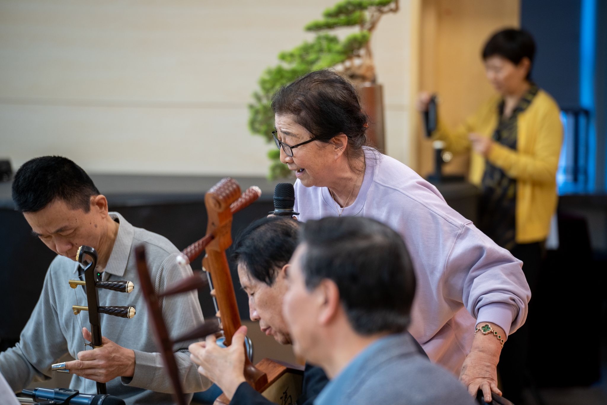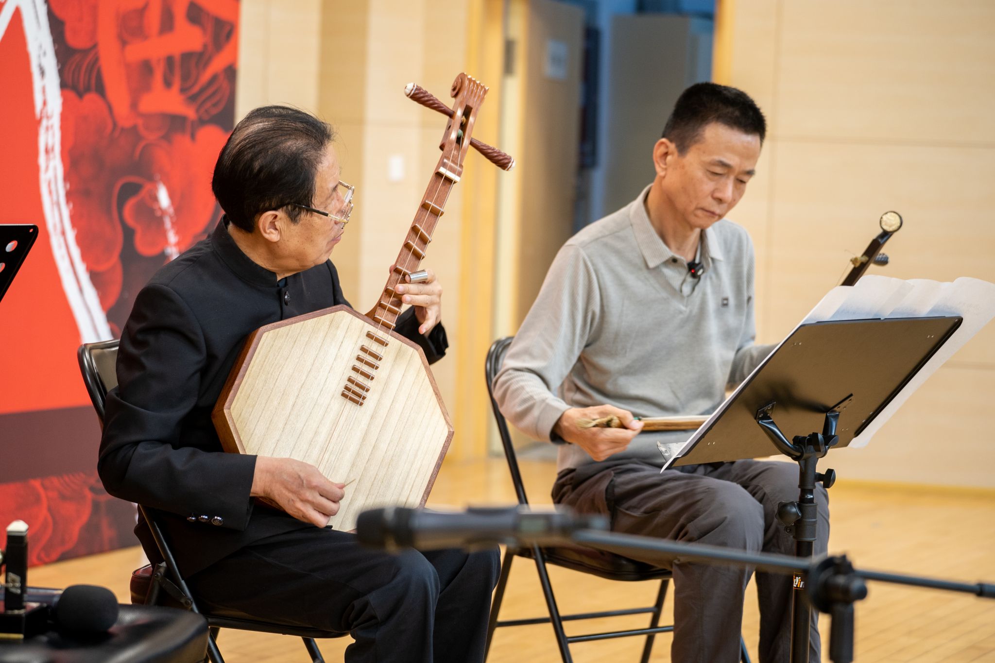工作坊环节中,王铁牛、聂四季以其数十载深耕剧团的丰厚积淀,生动诠释了碗碗腔伴奏艺术的精髓,更与沈诚一起现场展示了碗碗腔器乐演奏的精妙配合。王铁牛充分展现了月琴在碗碗腔中“说话般”的叙事性与高度音乐化的人物心理刻画能力。聂四季则聚焦于硬弦与唱腔的伴奏关系,现场演示了不同行当、不同情绪的腔调变化,揭示了戏曲音乐“依字行腔、腔随情转”的美学法则。他们的现场演绎,绝非简单的技巧展示,传递出毕生扎根戏曲舞台所淬炼出的“味儿”——那种源自生活、根植传统、融入血液的音乐感与生命力淋漓尽致地呈现。工作坊现场被誉为“碗碗腔皇后”的一级演员、著名表演艺术家温喜爱受邀与王铁牛、聂四季及沈诚现场合作了一首碗碗腔代表作品《杀妲己》,随后,活动参与者与三位艺术家共同合奏了“花音”“苦音”慢板、《姓桃居住桃花村》等碗碗腔经典曲目,在近距离观摩求教中亲身体验“口传心授”的传承智慧,深刻领悟“技术易得,韵味难求”的艺术真谛,更对传统戏曲艺术的精神内核与传承规律形成了更为真切的认知。