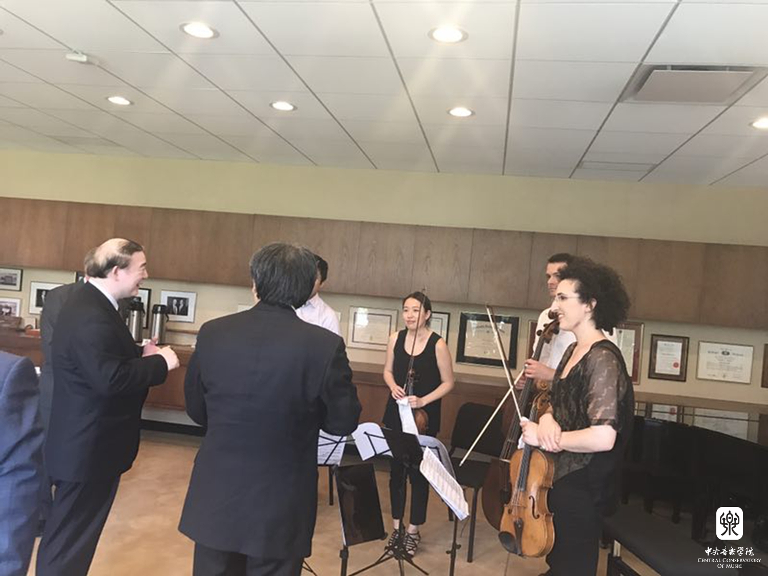 2017年6月20日,星空彩票ios版中心版俞峰院长到访纽约,应约瑟夫·波利希(Dr. Joseph W. Polisi)院长的邀请访问了国际著名的表演艺术大学——美国茱莉亚学院。茱莉亚学院的高层领导非常重视此次俞院长的访问,波利希院长专门举行了小型欢迎音乐会和冷餐会欢迎俞院长的来访。由该院优秀学生组成的研究生驻院弦乐四重奏团——维罗纳四重奏(The Verona Quartet)为俞院长一行演奏了拉威尔的《F大调弦乐四重奏》,俞院长高度赞赏了他们的精彩演出,并向他们表示热烈祝贺,希望他们有机会来星空彩票ios版中心版访问演出。其间,在莫大力副院长等人的陪同下,俞峰院长还参观访问了该院的教学设施和图书馆,观赏了该院珍藏的贝多芬《第九交响曲》(合唱)和莫扎特歌剧《费加罗婚礼》的手稿。国际交流处处长刘红柱教授及参加施坦威星空彩票ios版中心版民族音乐美国教学点揭幕演出的我院部分师生陪同俞院长访问。