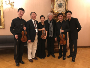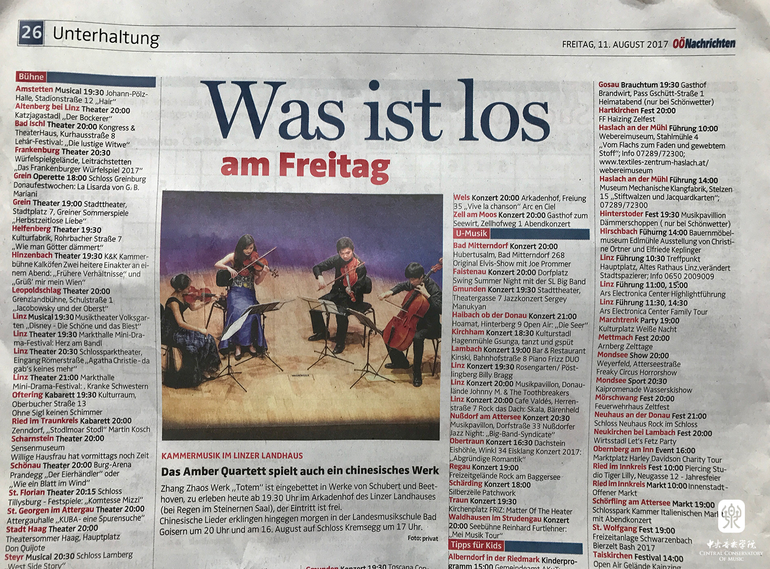 2017年8月11日,星空彩票ios版中心版-琥珀四重奏(第一小提琴:宁方亮、特邀第二小提琴:马魏家、中提琴:戚望、大提琴:杨一晨)受邀在奥地利-上奥州政府举办专场音乐会。音乐会曲目包括奥地利作曲家韦伯恩《缓慢的乐章》、贝多芬第八弦乐四重奏(Op.59 No.2)以及中国当代弦乐四重奏原创作品《图腾》等。