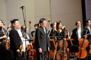指挥陈正哲与乐团特邀首席梁大南谢幕 摄影:郭名洋 |