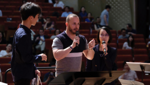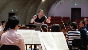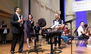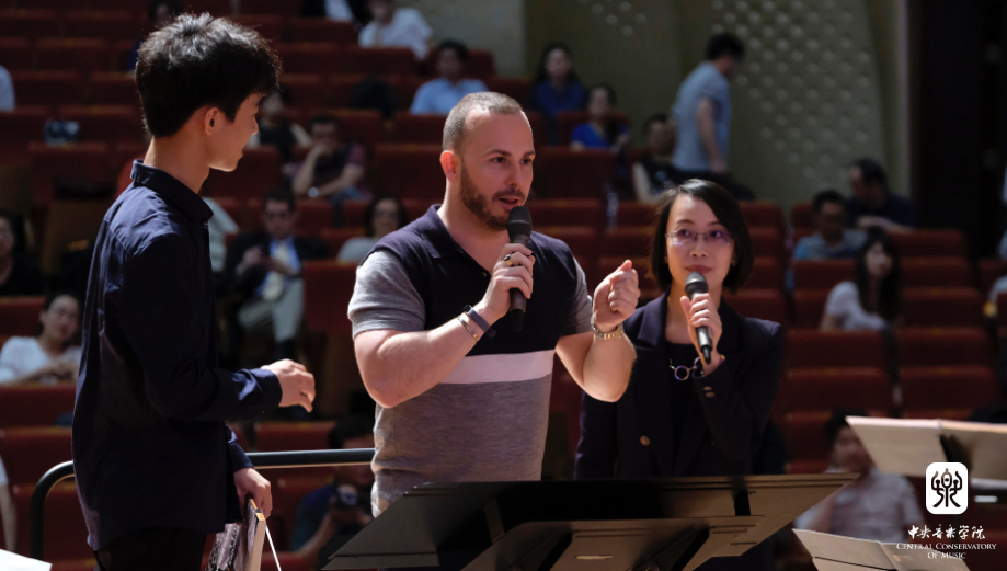 在上午的大师班课上,来自我院大学和附中的李京展、钱金戈、张柏赫、尹炯杰同学分别指挥了门德尔松《第四交响曲》(意大利)的各个乐章,雅尼克先生就作品内涵、创作背景和指挥技术和风格等方面针对每个同学给予了耐心、细致的精心讲解,并施与指挥语言予以具体辅导,对指挥学生们的才华表示赞赏。大师课由指挥系陈冰老师担任翻译。