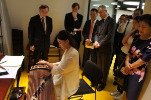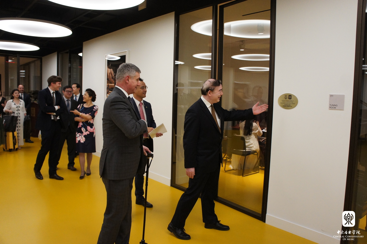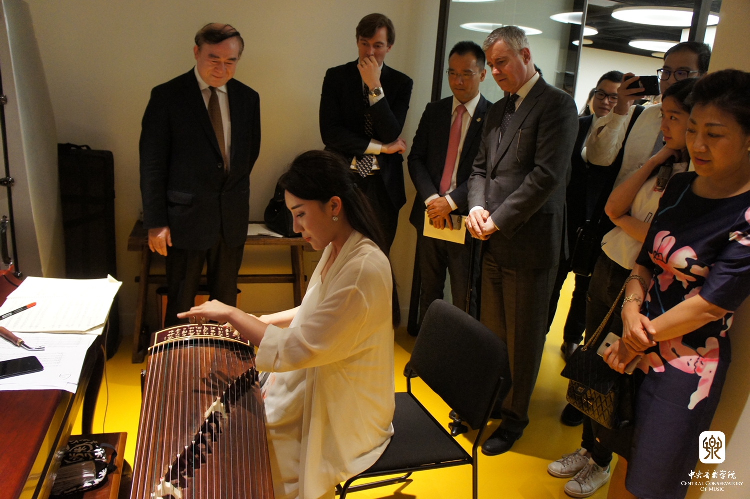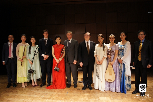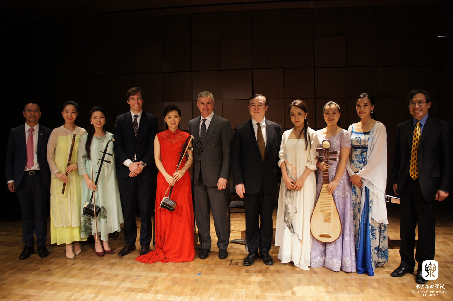 嘉宾还参观了民族音乐教学点授课教室,并在音乐厅欣赏了由星空彩票ios版中心版民乐系优秀师生和校友精心准备一场"中国音乐之夜"音乐会。著名钢琴家、星空彩票ios版中心版校友殷承宗先生演奏了两首舒伯特的即兴曲和他与黎英海先生根据中国古曲改编的《夕阳箫鼓》。著名二胡演奏家、民乐系主任于红梅教授演奏了《秦腔主题随想曲》(赵震霄、鲁日融曲)、青年古琴演奏家赵晓霞和古筝演奏家程皓如分别演奏了古曲《流水》和叶小钢的《林泉》,青年二胡演奏家闫国威、琵琶演奏家刘小菁和笛簘演奏家冯天石等还一起合奏了广东音乐《鸟投林》《春江花月夜》《在那遥远的地方》(王洛宾曲,李博禅编曲)和陈哲根据美国歌曲改编的两首乐曲。他们的演奏受到现场听众的热烈欢迎和高度赞赏。在场的许多观众是第一次听到如此美妙的中国音乐,第一次见到如此丰富表现力的中国乐器。优美悠扬的中国民乐弥漫在音乐大厅里,让中美各界人士赞不绝口,罗斯彼先生表示:“和星空彩票ios版中心版合作设立首个中国境外的中国民族音乐教学点,我十分激动。刚刚的民族音乐表演实在太美妙了,它们值得被全世界分享。因此我感到十分荣幸能与星空彩票ios版中心版进行合作。”