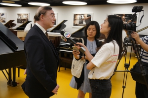 星空彩票ios版中心版俞峰院长、中国驻纽约总领馆副总领事张美芳女士、施坦威全球首席执行官罗恩·罗斯彼先生、在美艺术家及部分星空彩票ios版中心版校友近百位中外嘉宾参加了揭幕仪式。