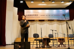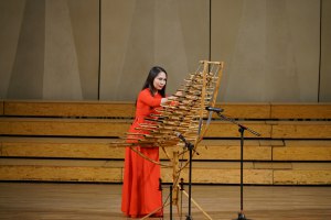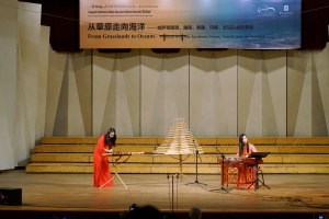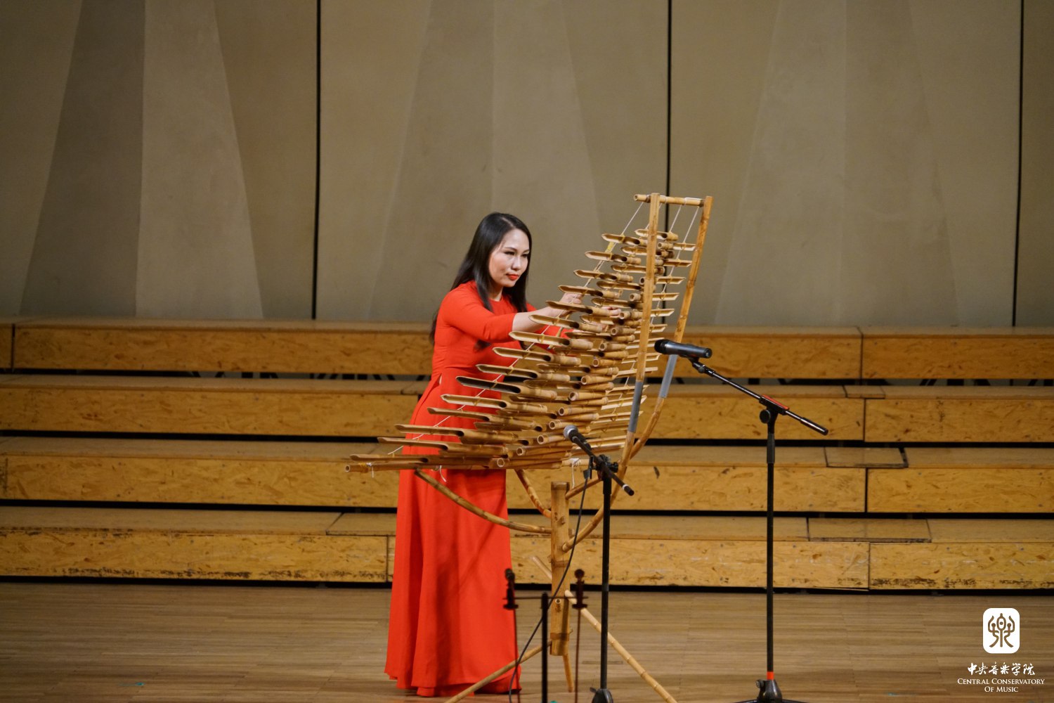 第二板块,从中亚内陆的丝绸之路跨越到欧亚洲大陆东南沿海,是越南传统音乐的展示。担任演出的是来自越南国家音乐学院传统音乐系副系主任的阮氏华灯博士,她演奏了竹乐器克隆布特《春天来了》(与扬琴合作,扬琴满慧,作曲Huu Xuan)、特龙琴独奏《回到高原》(作曲Do Loc)及竹乐器合奏《特龙琴流水声》(作曲Tran Dang)。阮氏华灯曾在星空彩票ios版中心版留学多年,在陈自明教授的指导下学习,获得博士学位。阮氏华灯博士介绍了越南的竹乐器克隆布特、特龙琴,邀请了她在中国的好朋友——星空彩票ios版中心版的老师同学一起演奏乐器合奏《特龙琴流水声》,叮叮咚咚的竹乐声将人们带入到碧浪沙滩的东南亚海域。
