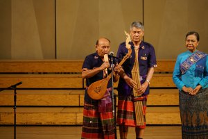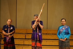 第三板块是泰国传统音乐展演,来自泰国的郎民间音乐表演艺术团表演了泰国东北部的民间音乐。四位音乐家是来自泰国玛哈沙拉堪皇家大学音乐系的助理教授杰拉尔凯伊·克霍恩派尔洛特博士,泰国那空帕农大学的民族音乐学博士、杰出的莫兰音乐歌唱家拉特利苏芮魏莱·伯恩斯泰蓬夫人,杰出的民间音乐(兀特和蓬朗)演奏家宋萨卡·普莱图穆森先生,卡恩专业演奏家、那空帕农大学讲师约提卡斯里魏莱·伯恩斯提魄恩女士。主持人安平教授依次介绍了演出使用的四种泰国乐器,流行于泰国东北部的双排竹管的芦笙坎恩(Khaenan),由12或者13个竹管围成一圈的吹奏乐器Wot(兀特),一种长颈弹拨琉特琴Pin(聘),由12根硬木组成的泰国东北木琴Pong lang(蓬朗),四位演奏家为现场观众演示。