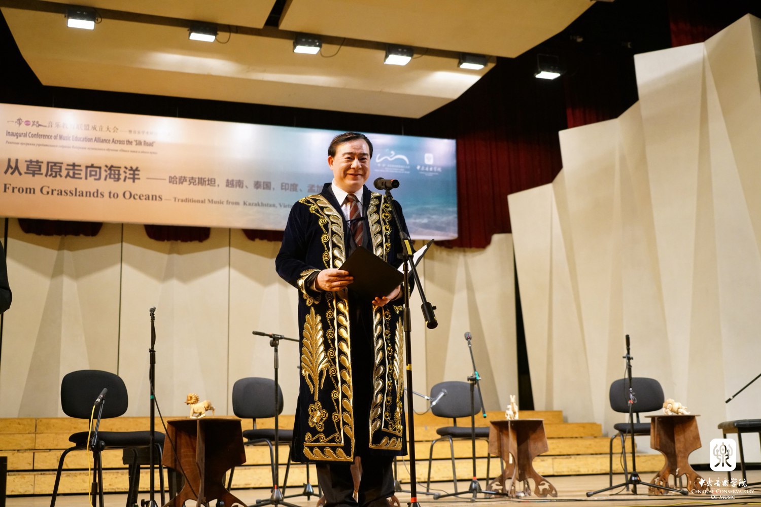 音乐会正式开始前,星空彩票ios版中心版院长俞峰身穿乌兹别克斯坦音乐家赠送的长袍宣读了“一带一路”音乐交流倡议书:我们相信音乐能够架起沟通的桥梁,我们共同发起成立一带一路音乐教育联盟,其宗旨是为了加强一带一路国家音乐学院之间的交流与合作,在传统音乐的保护与当代音乐的创作、音乐表演、音乐研究和音乐教育方面发挥作用。俞峰院长代表主办方向各位院长、学者和音乐家们表示敬意,对他们为这次活动成功举办做出的贡献表示感谢,并预祝今晚的音乐会圆满成功,期待不久的将来再次相聚。