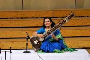 第四板块是印度音乐的演出。印度当代著名的古典音乐演奏家和理论家、印度德里大学音乐学院前院长阿奴帕姆·玛吉(Performed by: Anupam Mahajan)演奏西塔尔琴《北印度拉格“耶曼”》,由目前在星空彩票ios版中心版教授印度音乐的萨瑞特•达斯(Sarit Das )先生担任塔布拉鼓伴奏。这是一种在前半夜演奏的拉格,音乐由轻盈疏落的鼓点、悠扬清越的音调到暴风疾雨般的鼓点、令人眼花缭乱的加花变奏旋律,西塔尔与塔布拉鼓时而是相互衬托,时而形成复调的对奏、竞奏,舒缓到情绪热烈,表达了欢乐舒心、心满意足感情,展示了音乐家极高的音乐技巧。