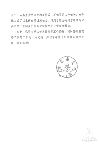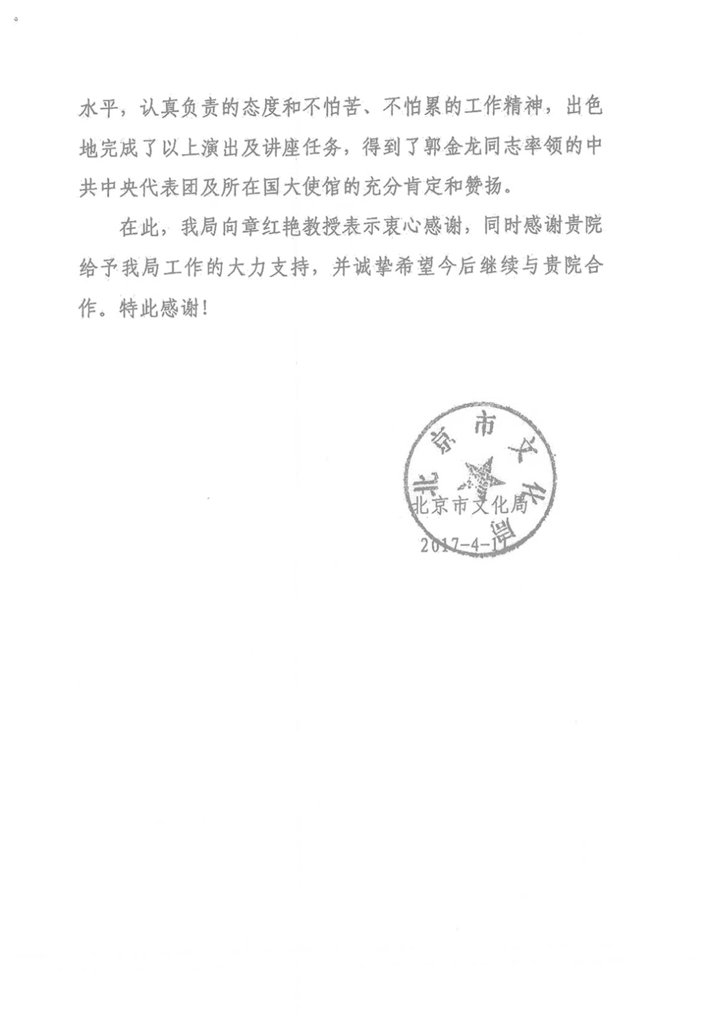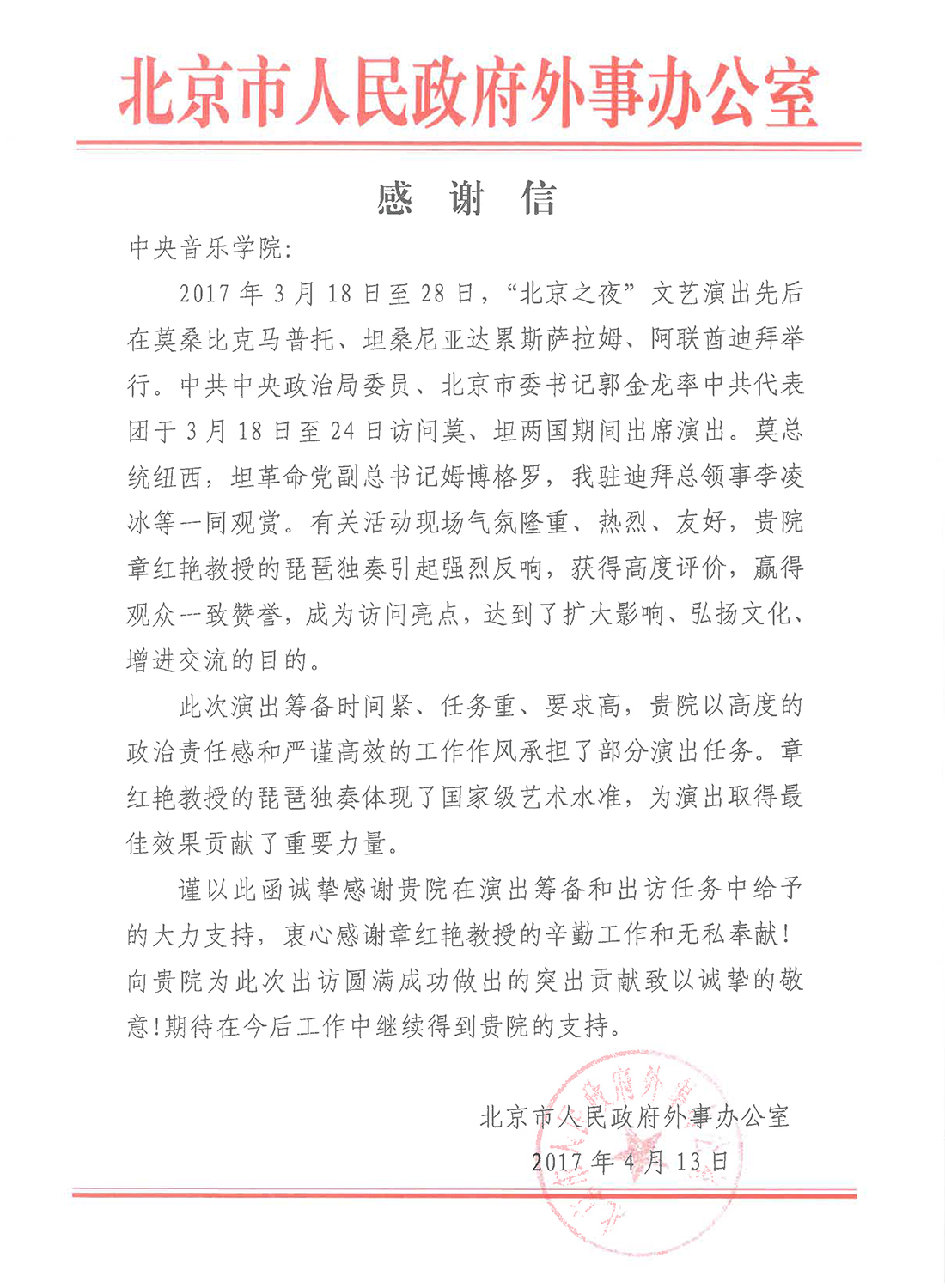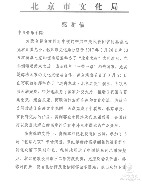 近日,北京市外事办公室和北京市文化局分别致函我校,对我校在中共中央代表团访问莫桑比克、坦桑尼亚及阿联酋期间,积极支持"北京之夜"的文艺演出表示诚挚谢意!演出很好地展示了中国民乐的风采、魅力,圆满完成了中联部、北京市委、市政府的任务,得到郭金龙同志、各国政府和当地观众的高度评价!并对我校民乐系章红艳教授高超娴熟的演奏、优良的工作作风给予高度赞扬!