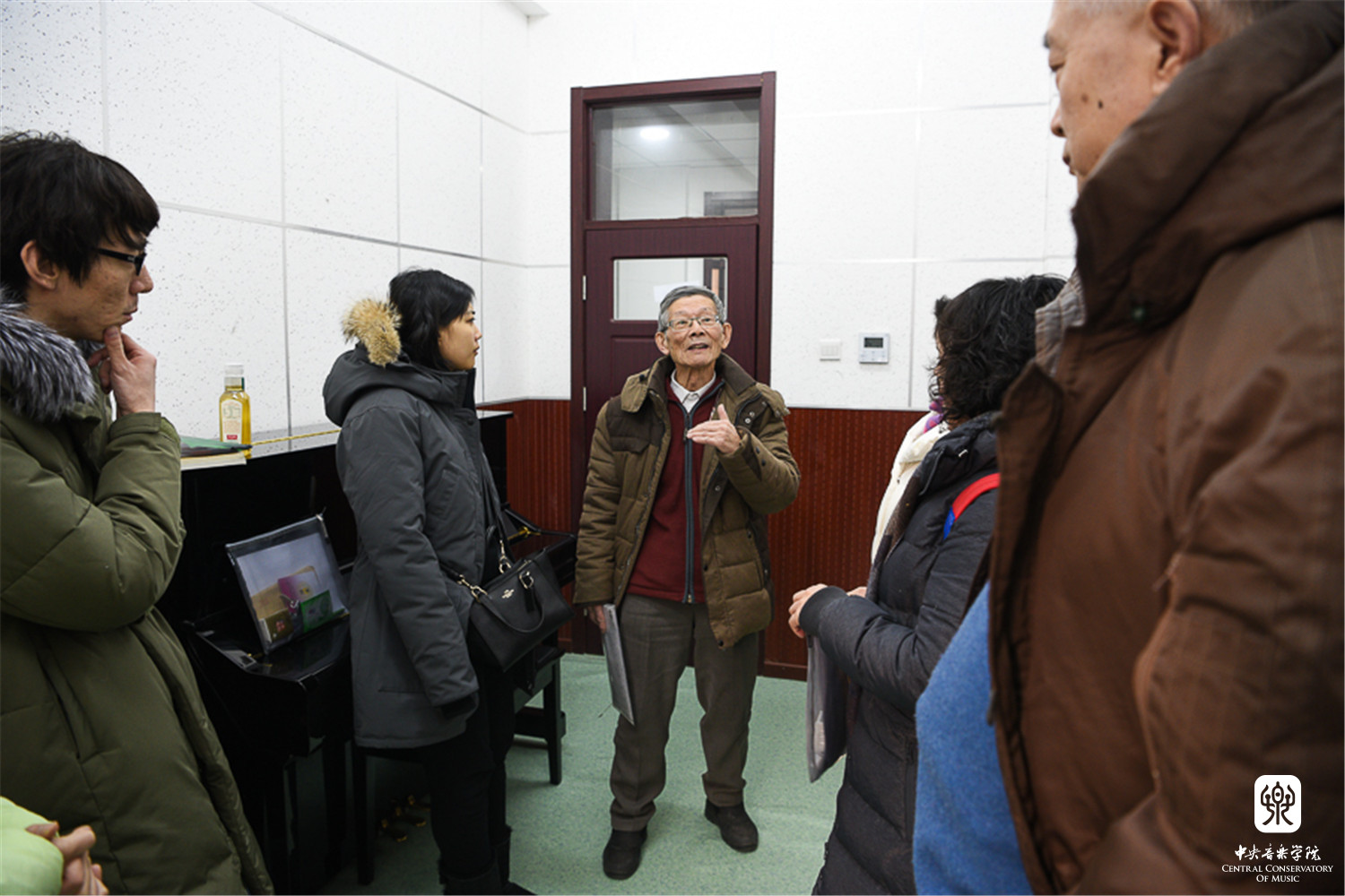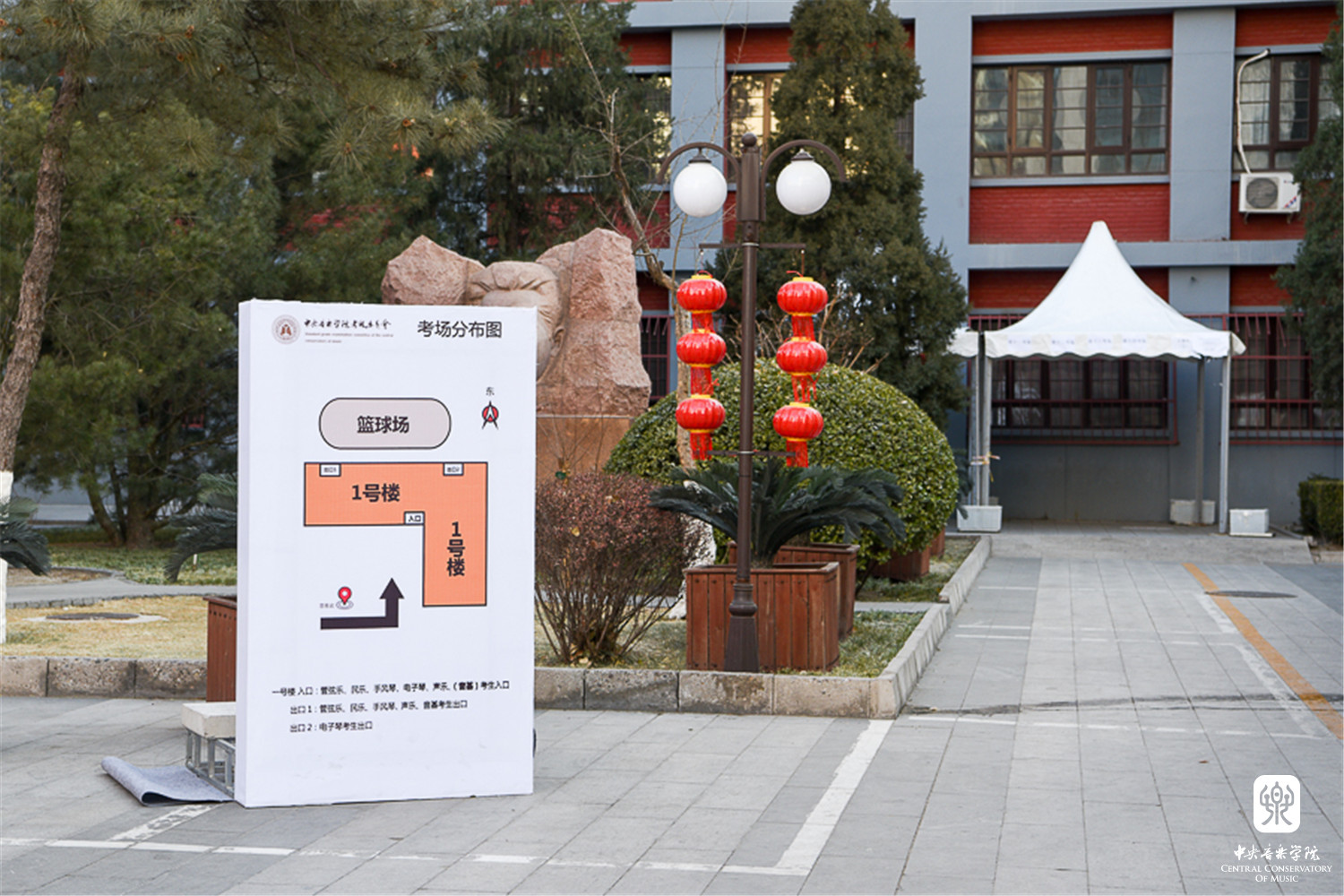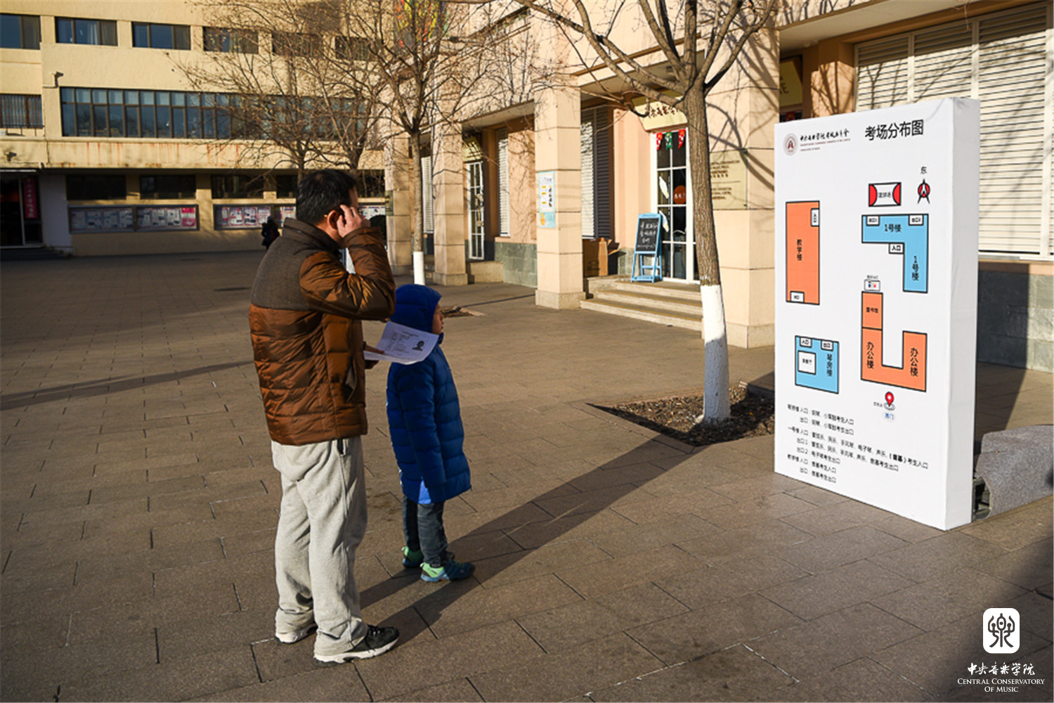 由于学院场地有限、天气寒冷等因素,考级委员会为等候考生的家长打开教学楼大厅及办公楼楼道作为休息御寒场所。