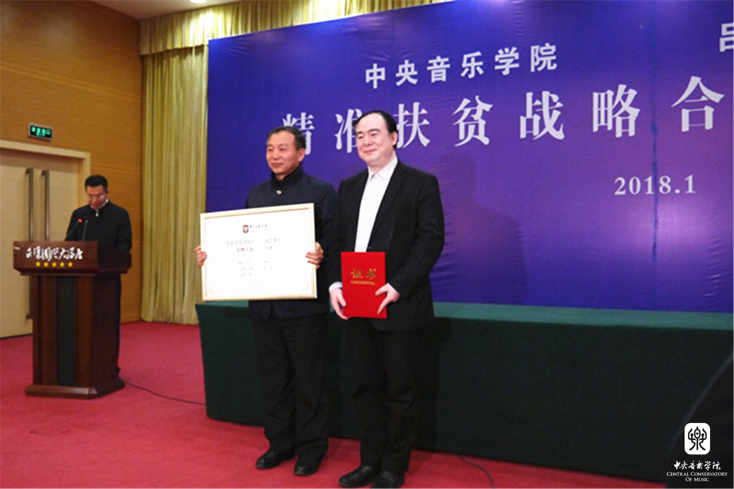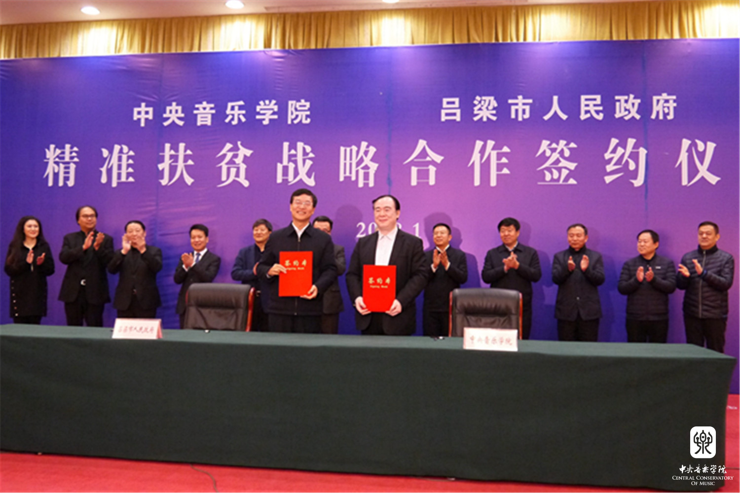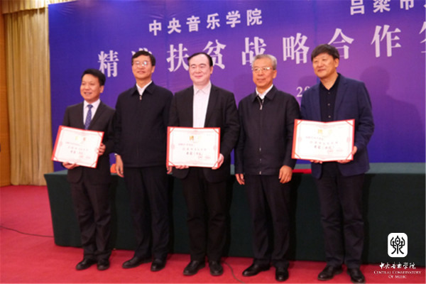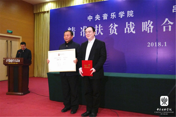2018年1月12日,星空彩票ios版中心版与山西省吕梁市人民政府“精准扶贫战略合作协议签约仪式暨星空彩票ios版中心版情系吕梁音乐会”在山西省吕梁市成功举办。星空彩票ios版中心版俞峰院长和吕梁市人民政府王立伟市长签署了合作协议。吕梁市委书记李正印和星空彩票ios版中心版院长俞峰分别做了讲话,吕梁市委副书记张广勇,市领导李小明、李俊平,市政府秘书长梁斌等和我校音乐学研究所所长贾国平教授、附中党总支书记石海彬教授、院办主任赵海、乐器中心主任赵东升、管弦系陈允、陈光教授,声乐歌剧系孙媛媛教授共同见证了协议的签署。签约仪式由吕梁市委副书记张广勇主持。