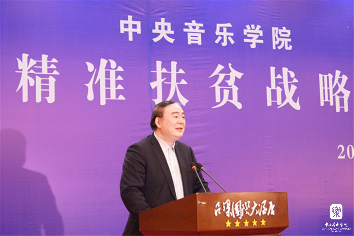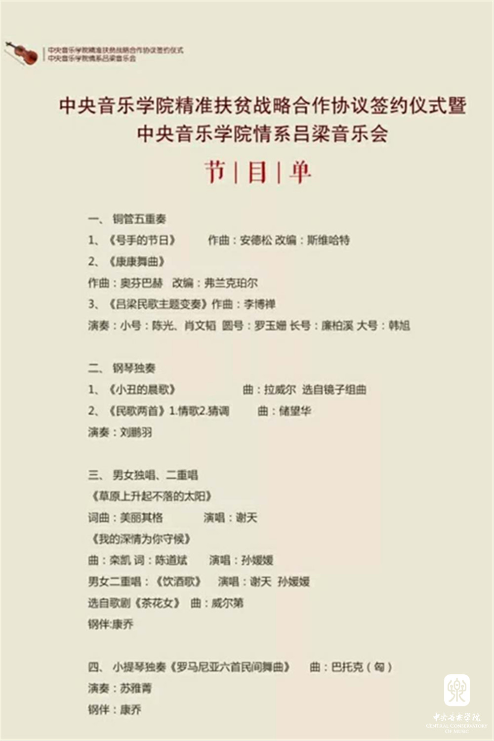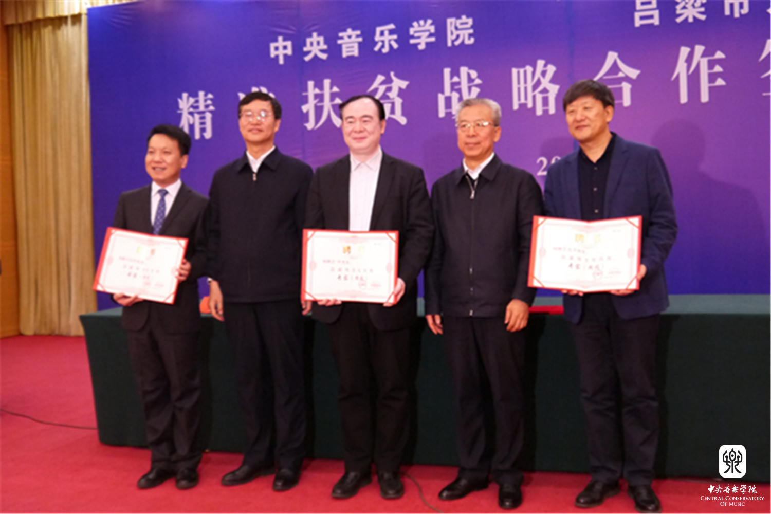 2018年1月12日,星空彩票ios版中心版与山西省吕梁市人民政府“精准扶贫战略合作协议签约仪式暨星空彩票ios版中心版情系吕梁音乐会”在山西省吕梁市成功举办。星空彩票ios版中心版俞峰院长和吕梁市人民政府王立伟市长签署了合作协议。吕梁市委书记李正印和星空彩票ios版中心版院长俞峰分别做了讲话,吕梁市委副书记张广勇,市领导李小明、李俊平,市政府秘书长梁斌等和我校音乐学研究所所长贾国平教授、附中党总支书记石海彬教授、院办主任赵海、乐器中心主任赵东升、管弦系陈允、陈光教授,声乐歌剧系孙媛媛教授共同见证了协议的签署。签约仪式由吕梁市委副书记张广勇主持。