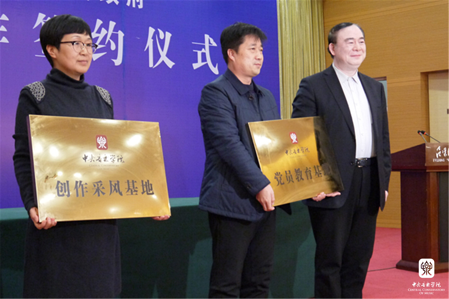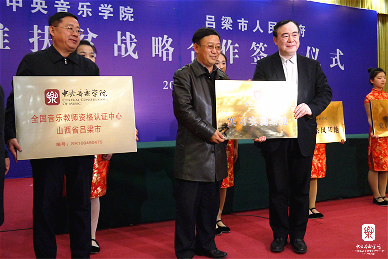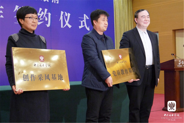 签约仪式上,俞峰院长为吕梁市晋绥革命纪念馆、吕梁市文联、吕梁市艺校、吕梁市教育局等单位授牌,吕梁市领导代表向我院颁发捐赠证书,并向俞峰、贾国平、石海彬等教授颁发特聘专家证书。