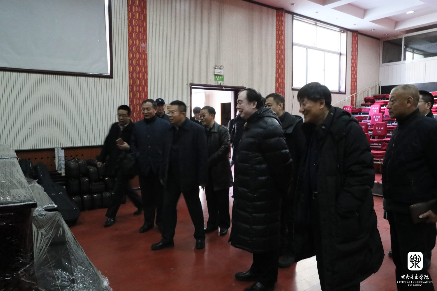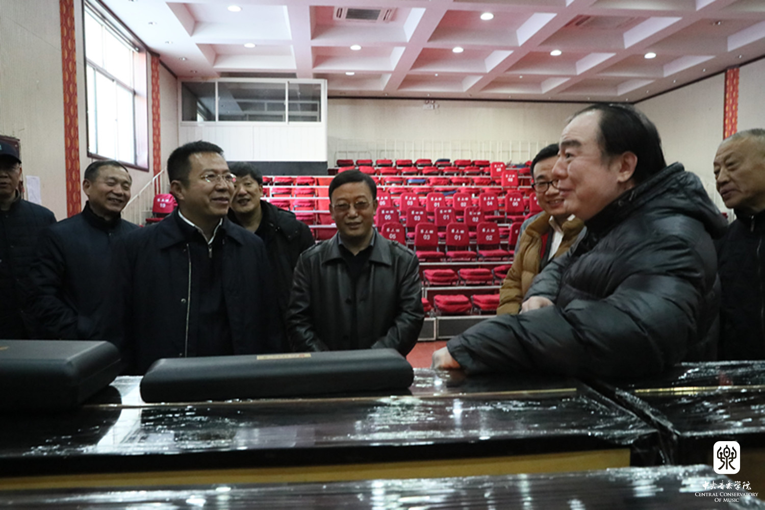 俞峰院长向吕梁市委张广勇副书记、吕梁艺校杨志明校长等介绍我校捐赠的乐器