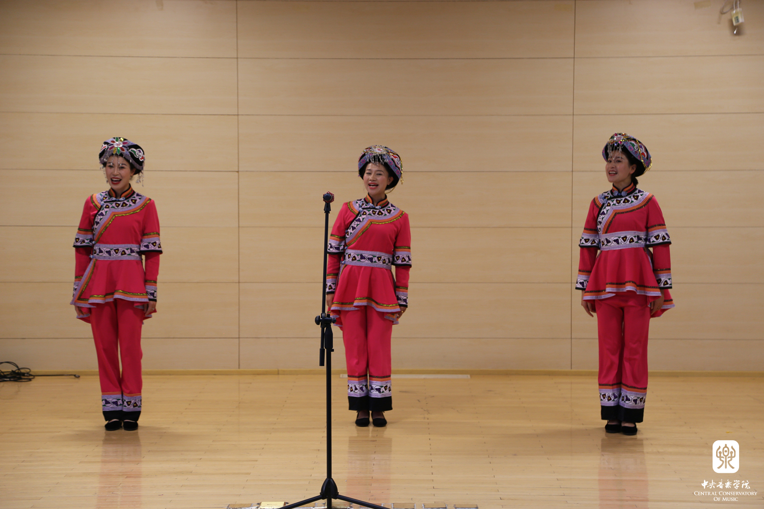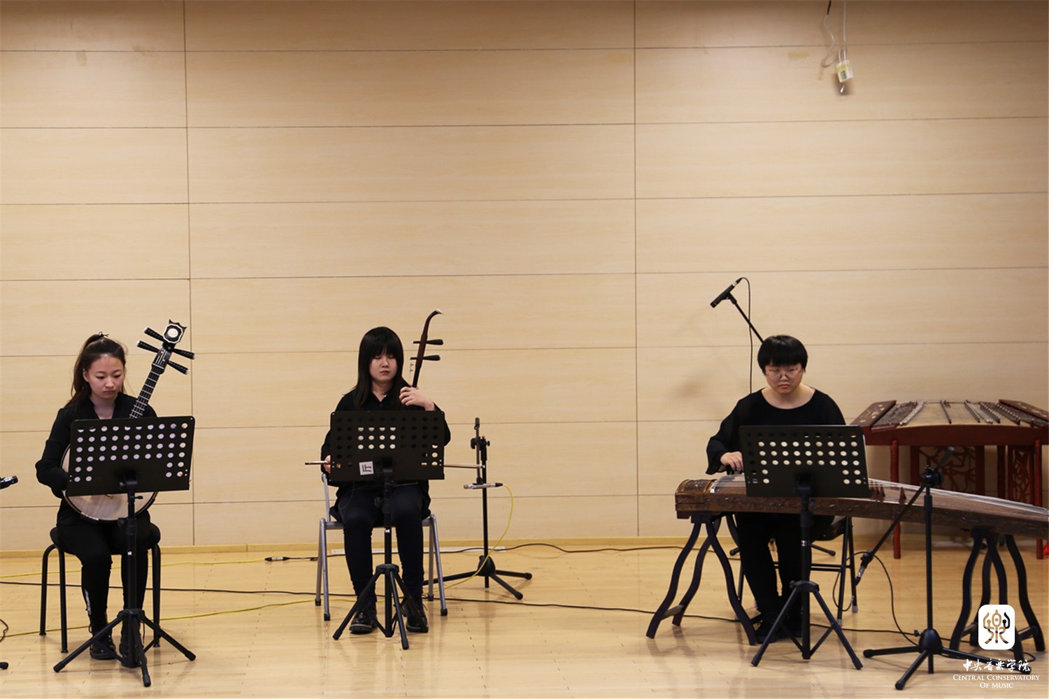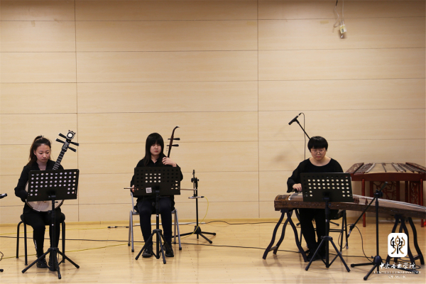 第一个节目是此次毕节采风的音乐实践成果之一。在织金县采风时,音乐学系学生听到了苗族一首优美的芦笙曲《苗家好地方》,他们将这首曲子进行整理记谱,由苏哲进行作曲改编,在此呈现了由二胡、中阮、古筝的民乐合奏版本《苗家好地方》。由白皎旭演奏中阮,李欣阳演奏二胡,解春霖演奏古筝。