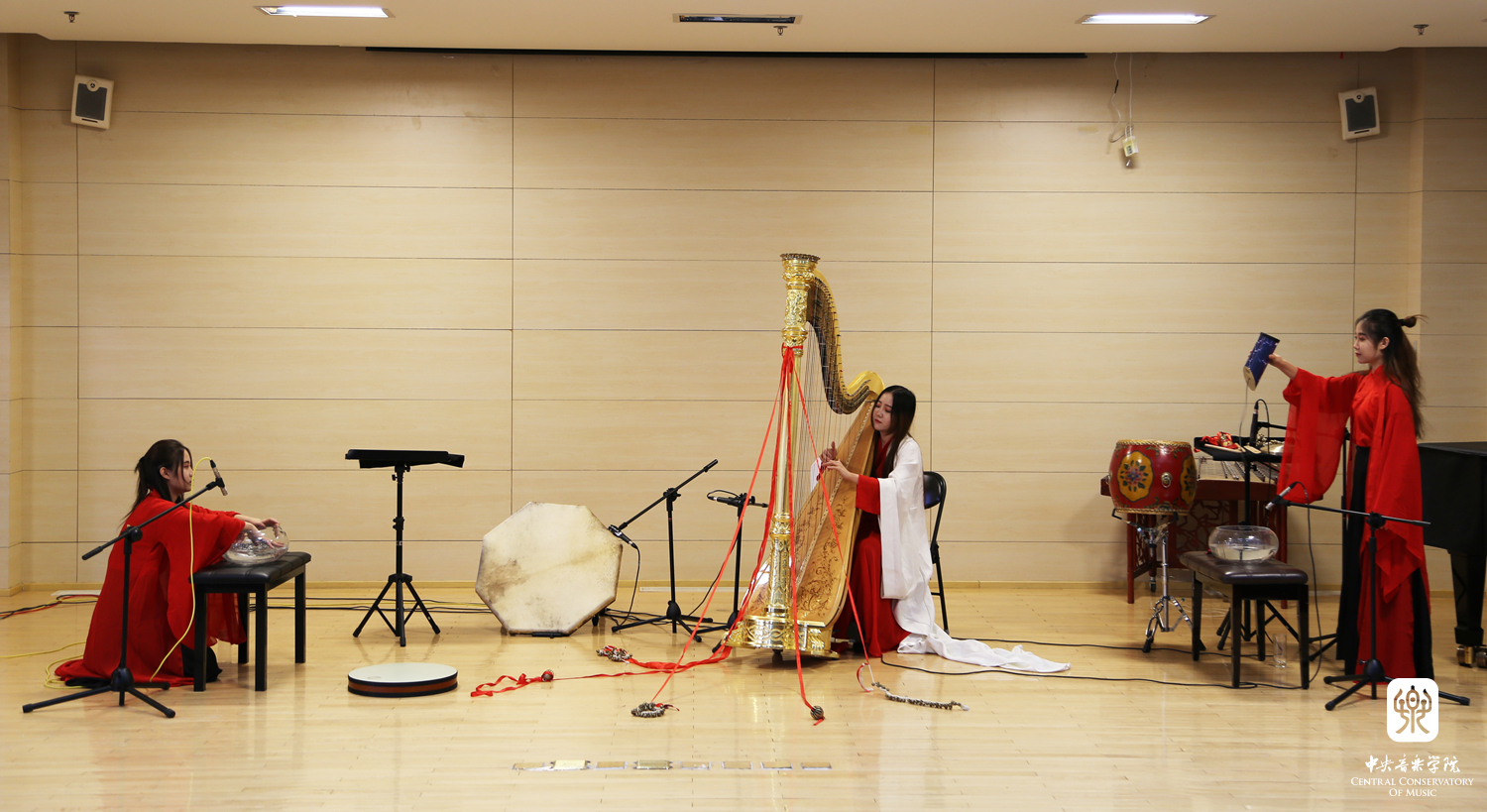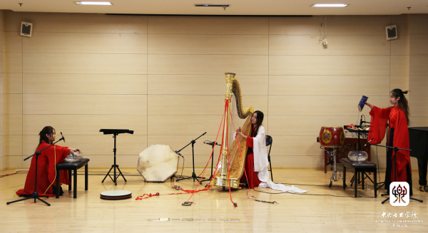 第三首作品,同样是来自北京青年艺术节的作品《荆轲》,由杜冰儿、杜雪儿、杜飞儿演出。演出前,徐之彤老师进行了讲解,以竖琴与多种打击乐器演奏的形式,不但挖掘并拓展了竖琴本身的音色,还拓纳入了多种音色,并加入与传统念白相近的吟唱旋律,以此呈现刺秦勇士荆柯的悲壮之旅。