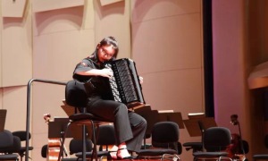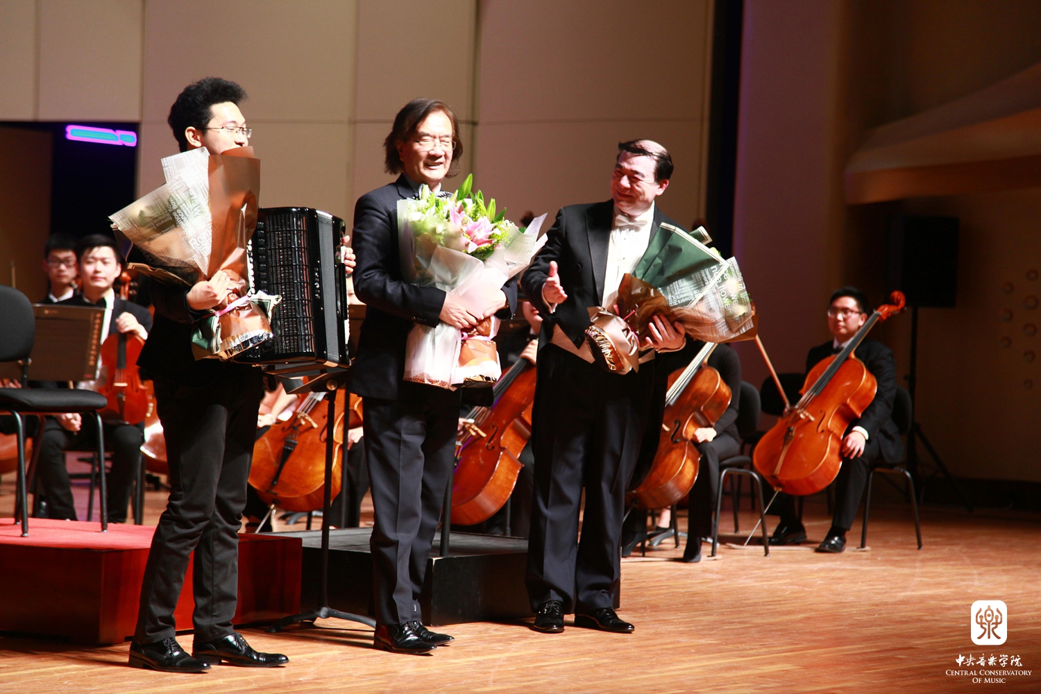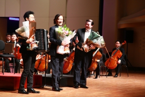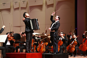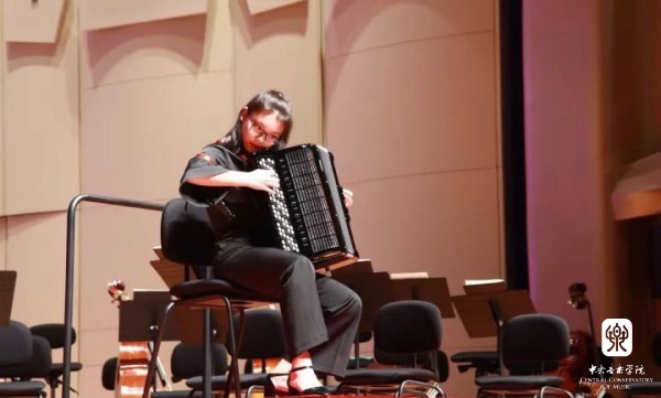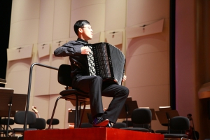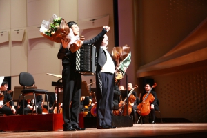 最后,我院青年手风琴演奏家星空彩票ios版中心版教师许笑男完成了由著名华裔作曲家储望华先生创作的协奏曲《生命之歌》的中国首演。在乐队的烘托下,许笑男老师完美演绎了这首极具中国特色的原创手风琴作品,将音乐会推向高潮。