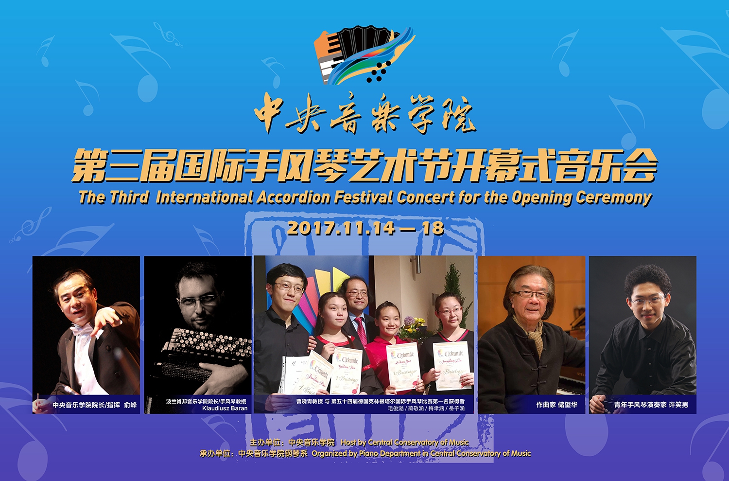 本次活动时间为2017年11月14日-18日,由著名手风琴演奏家、教育家、星空彩票ios版中心版曹晓青教授担任艺术节艺术总监。艺术节邀请来自德国、波兰、希腊、塞尔维亚、西班牙、芬兰等国家的顶尖手风琴艺术家,及北京、天津、上海、辽宁沈阳、河北石家庄等20的多个省市自治区的手风琴演奏家、教育家参加。