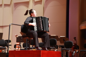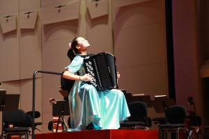 音乐会的开始,被誉为"历史性时刻"的四位德国克林根塔尔国际手风琴比赛不同组别冠军选手同台竞技,岳子涵(附中初一年级,少儿组第一名获奖者)、梅聿涵(附中高一年级,少年组第一名获奖者)、蔺敬涵(附中高三年级,青年组第一名获奖者)、毛俊澔(大学四年级,艺术家组第一名获奖者)分别献上以原创手风琴作品为主要选曲的精彩独奏。