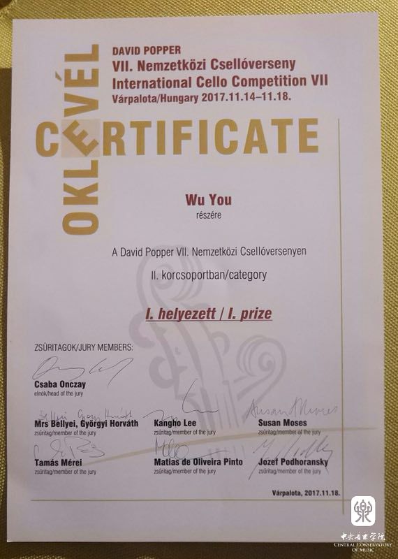2017年11月15日-18日,第7届匈牙利"大卫·波帕尔"国际大提琴比赛在匈牙利皇宫堡隆重举办。我校附中初一学生吴优经过三轮激烈角逐,最终荣获少年组第一名,并参演颁奖音乐会。该成绩是目前国内独立培养的选手在此项国际重大赛事中获得的最好成绩,在此向吴优及指导教师俞佳表示祝贺!