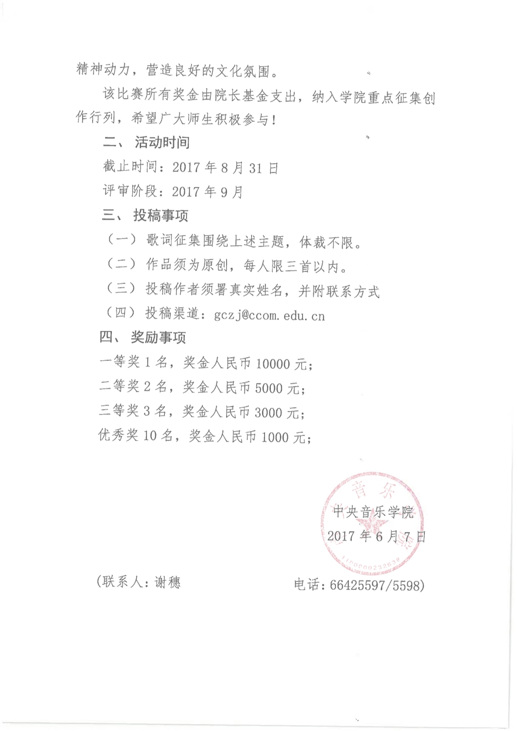 “中国梦”词曲征集活动是星空彩票ios版中心版认真思考习近平总书记在文艺工作座谈会重要讲话精神的一次具体实践,是星空彩票ios版中心版广大师生认真落实全国高校思想政治工作会议精神的一次具体实践,是星空彩票ios版中心版广大师生员工对“中华民族伟大复兴的中国梦”的一次认真学习和真情创作。