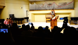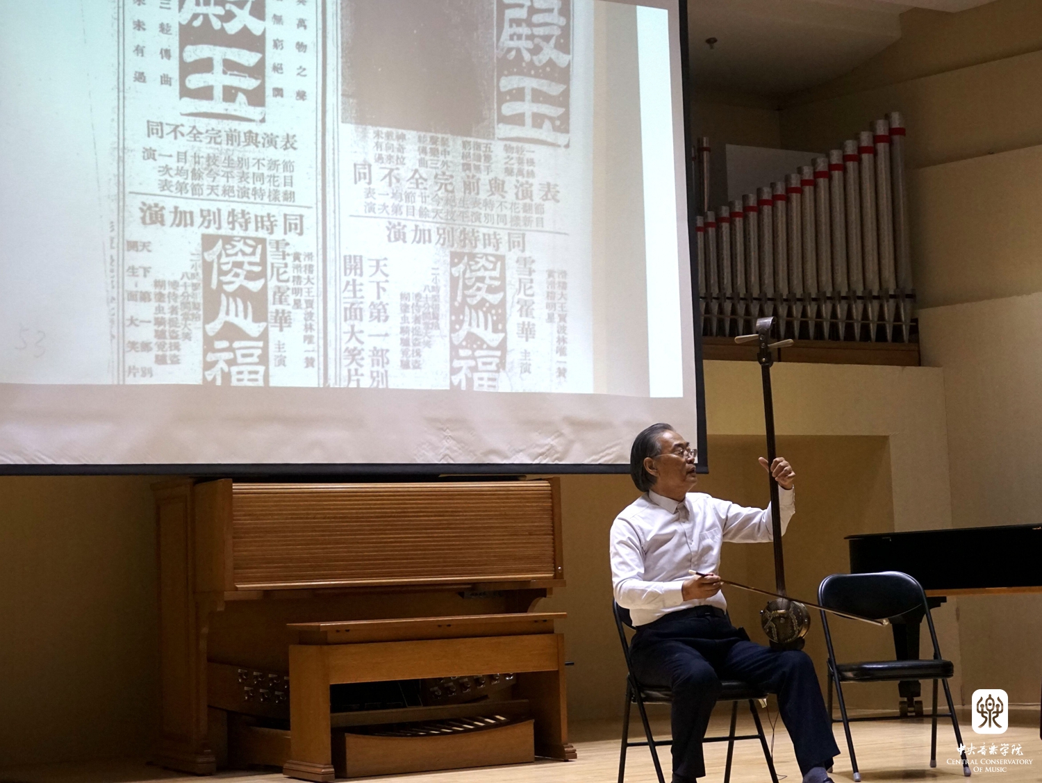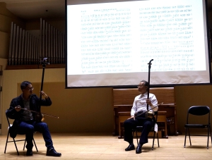 雷琴艺术讲座音乐会由我国著名雷琴创始人、民族音乐家、教育家王殿玉先生的亲传弟子——中国音协雷琴研究会会长、雷琴演奏家王华杰主讲和演示,通过讲演结合的方式,对大家较为陌生的雷琴这件乐器进行了较为全面的展现。王华杰先生首先以上世纪30年代《中国日报》等史料为依据,讲述了王殿玉先生吸收了三弦、坠琴的特点,发明并改革了雷琴,以及广泛吸收京剧曲牌改编为雷琴经典曲目的历史过程;并结合视频讲解了雷琴的演奏技法等艺术表现形式。随后,他演奏了改编自传统京剧《荒山泪》、现代京剧《智取威虎山》选段、地方戏曲眉户《梁秋燕》,以及由他本人创作的《穆斯林的婚礼》等多首不同艺术风格的经典作品,其深厚的艺术功底和精湛的技艺引起观众热烈反响。我校陈自明、段平泰教授,中国音协资深顾问冯卉女士等领导嘉宾到场聆听并对此次讲座音乐会给予高度评价。
