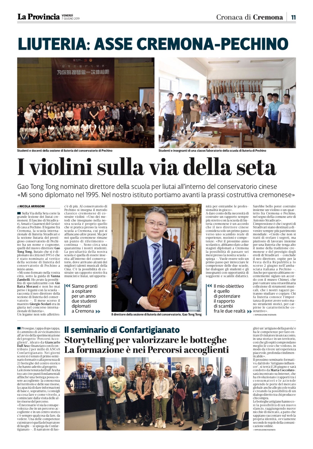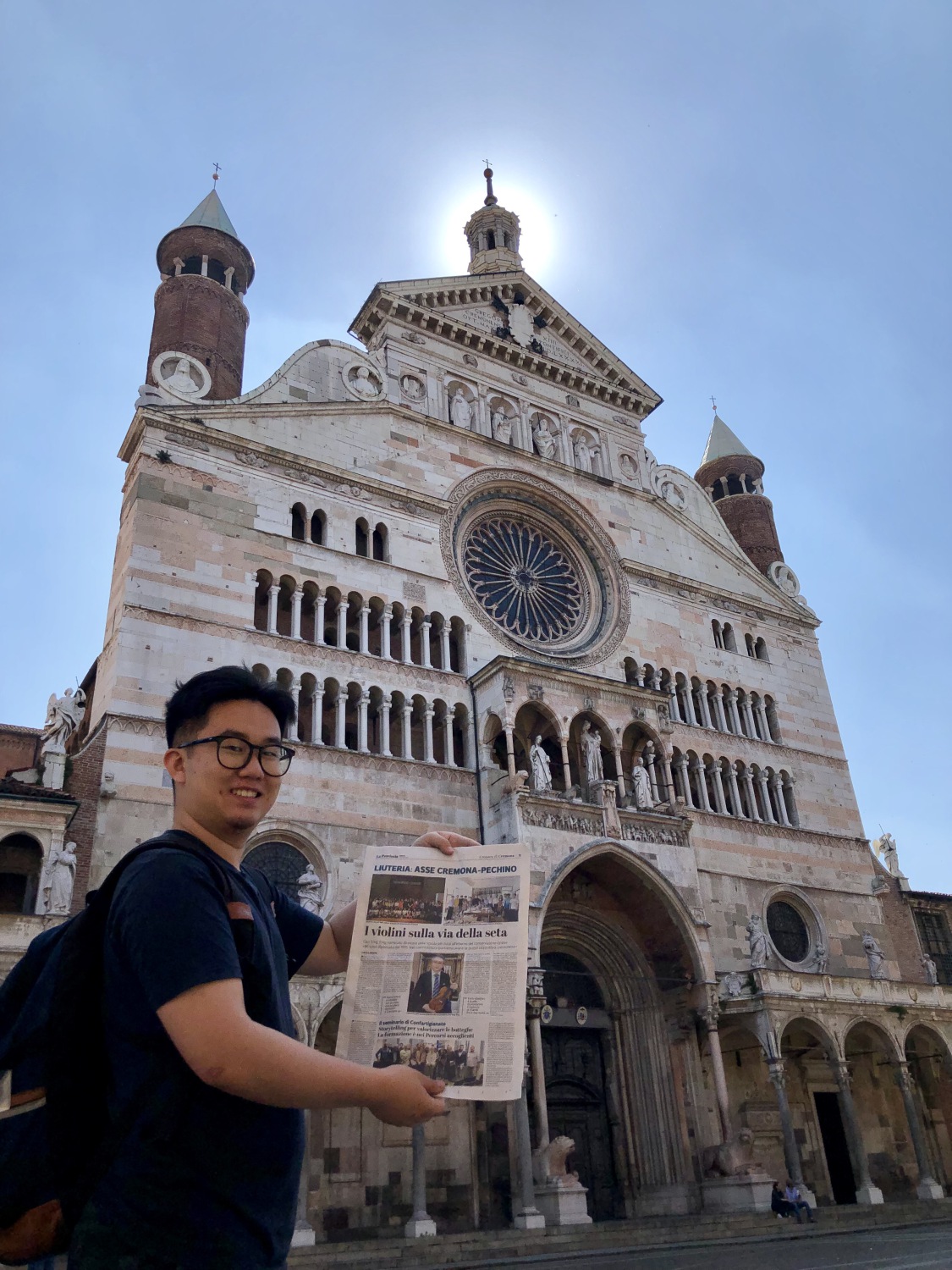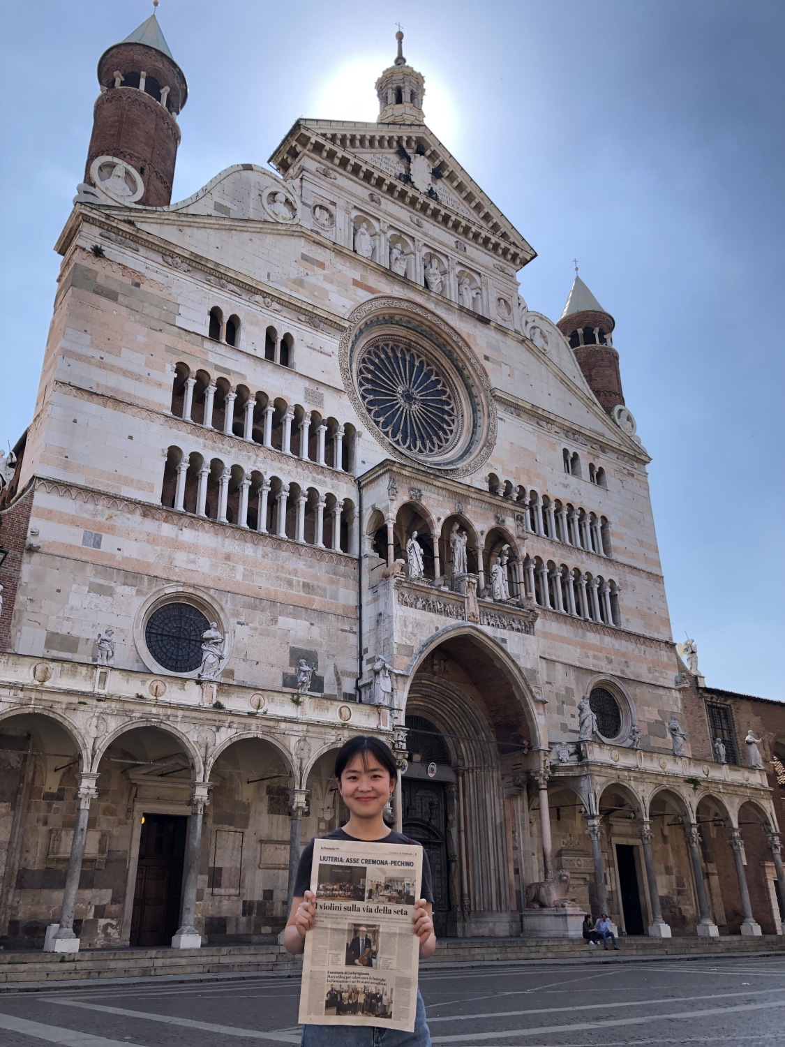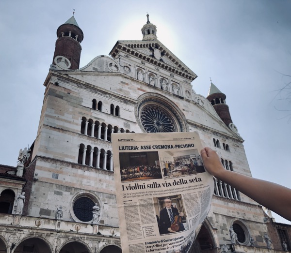 日前提琴故乡意大利克雷莫纳的著名媒体记者Nicola Arrigoni 对我校新上任的提琴制作研究中心副主任高彤彤老师进行了电话采访,之后在当地第一大报 La Provincia 上发表了题为“丝绸之路上的小提琴”的署名文章,与此同时就在这则新闻登报发售的当天,我校提琴制作研究中心的两名同学恰巧就在当地,随即买下报纸并在克雷莫纳的标志性建筑——主教堂前自豪地拍照留念。