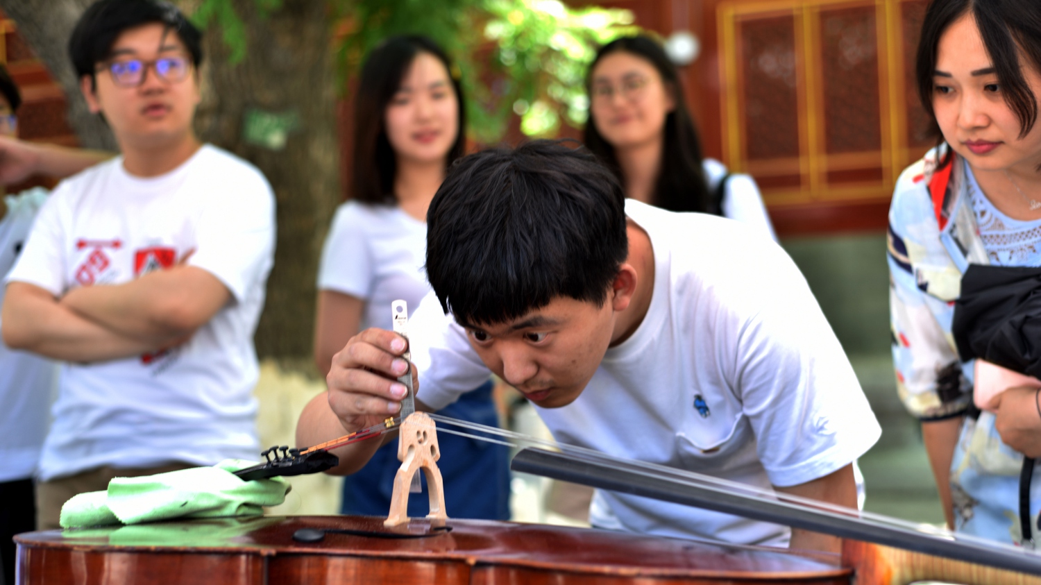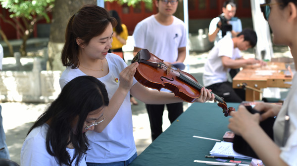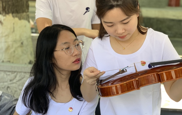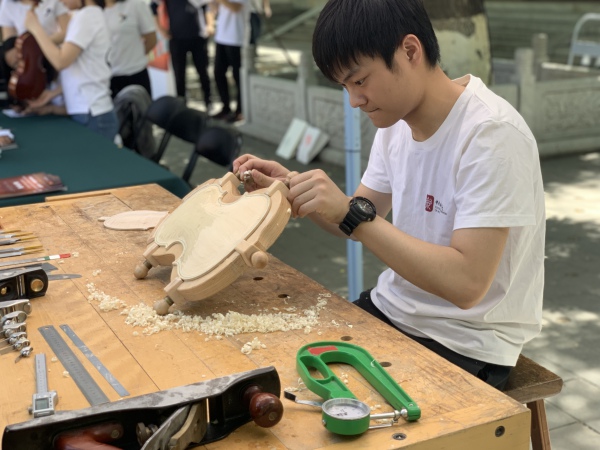 中午时分,学校室外大屏幕滚动播出本次活动的宣传片,展示了提琴制作研究中心(以下简称“中心”)师生们的日常教学与工作。宣传片细腻生动感人,其中的提琴演奏者是来自中心二年级的同学马小淅,演奏用琴来自中心青年学生手工制作,音乐由我校作曲系电子音乐录音艺术的研究生帮助录制完成。悠扬的琴声响彻校园,为活动增添了亲切之感。位于学校王府院广场,来自中心的党团青年师生为弦乐演奏专业的同学义务诊断提琴健康状况、解答提琴出现的问题,受到了各界的赞誉。前来诊断的同学络绎不绝。