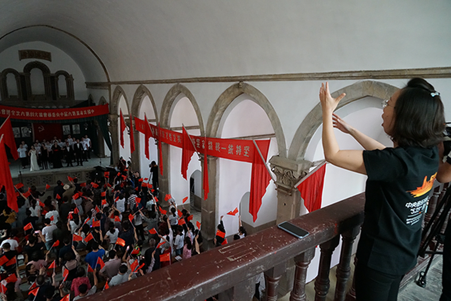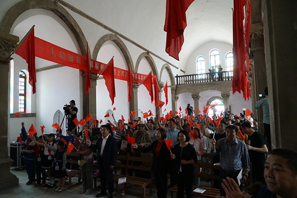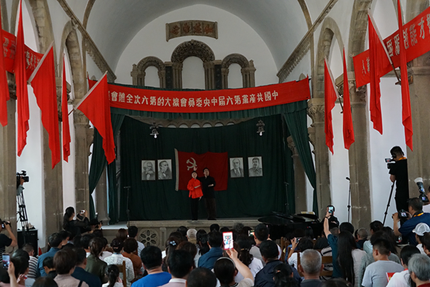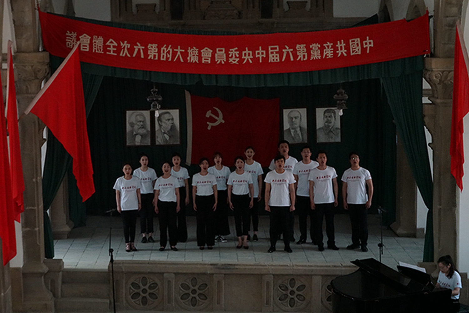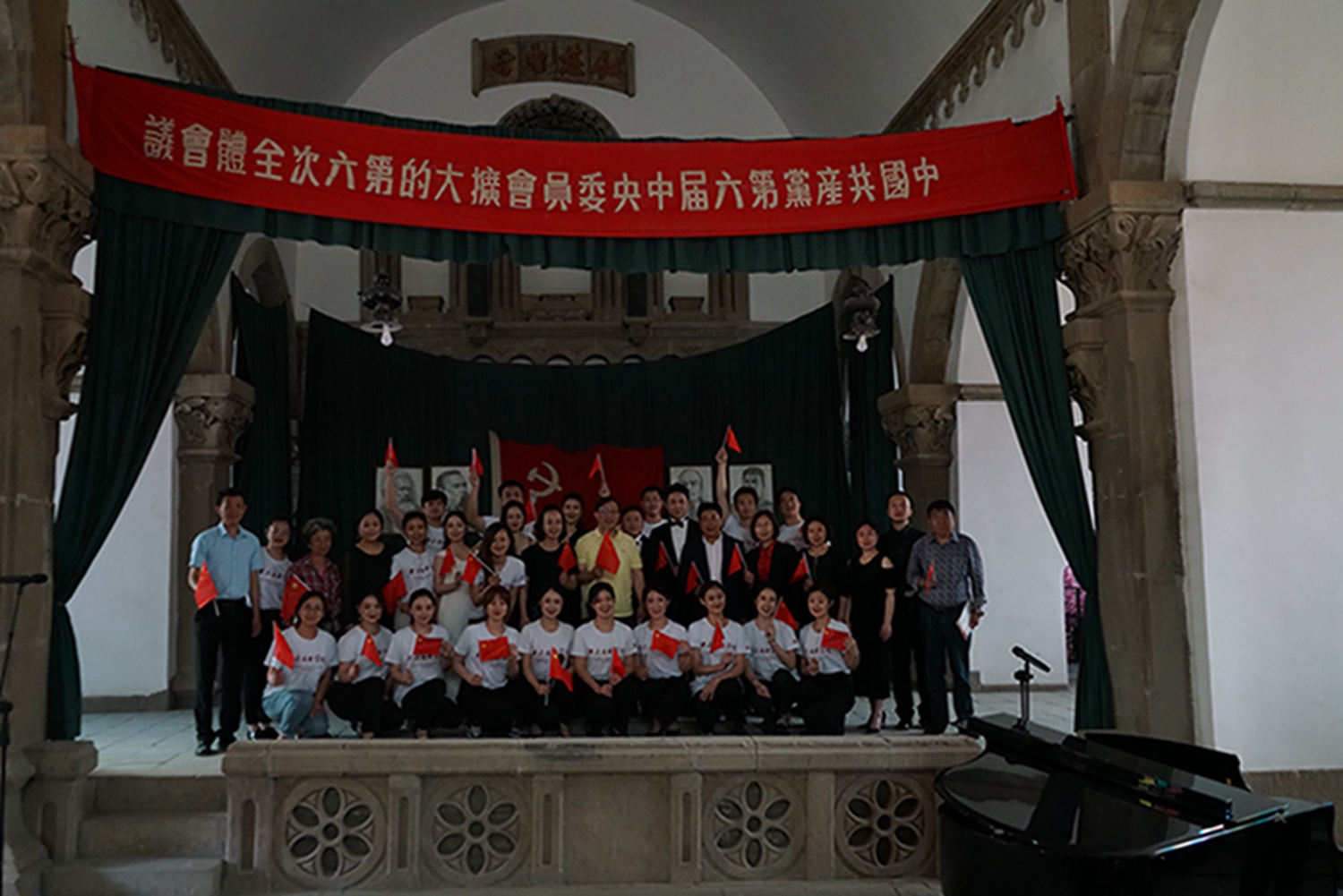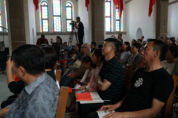 尤其值得一提的是,音乐会是在鲁艺旧址的大教堂举行,这是这座教堂时隔74年(延安鲁艺1945年迁往东北)以来的首次演出。这栋建筑历经风雨战火,墙体剥蚀,铺地灰色的青砖坑坑洼洼变成黄土色,然而当嘹亮的歌声灌满整个厅堂、在红色的横幅中激荡,庄严神圣的革命情怀油然而生,让人立时热泪盈眶。